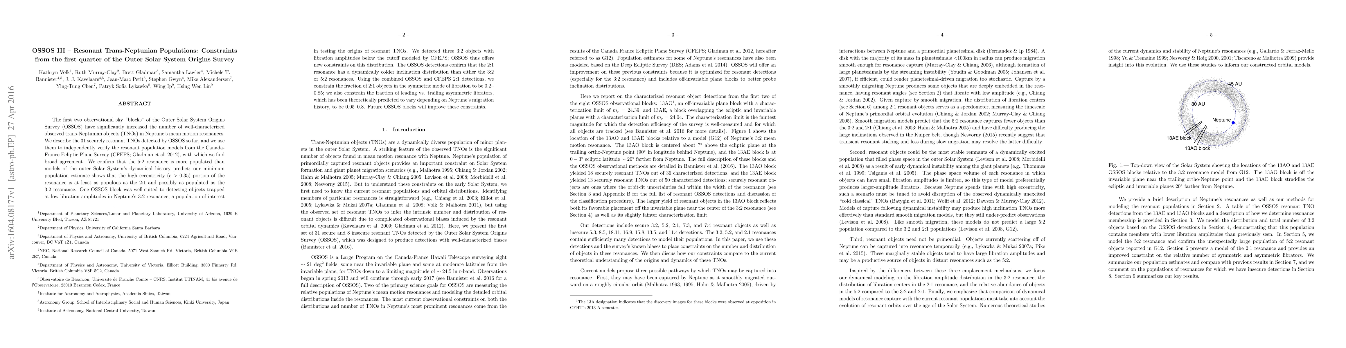 The OSSOS survey has identified 31 resonant trans-Neptunian objects (TNOs), confirming the 5:2 resonance's higher population than predicted and revealing new insights into the 3:2 resonance's low-libration population. These findings align with CFEPS models and suggest a colder inclination distribution in the 2:1 resonance.