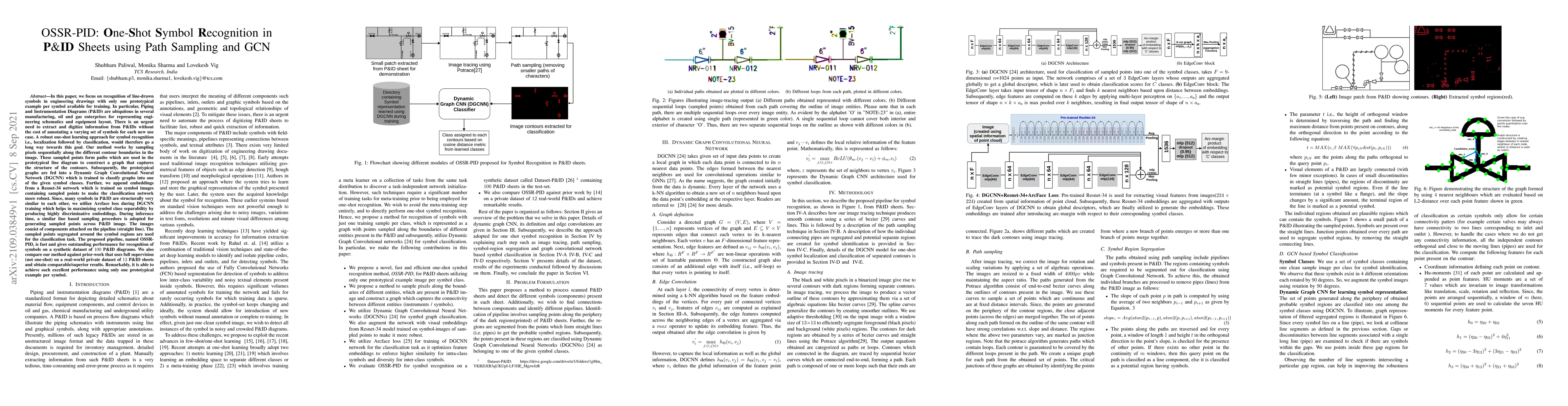 The paper proposes OSSR-PID, a one-shot learning method for recognizing symbols in Piping and Instrumentation Diagrams using path sampling and a Dynamic Graph Convolutional Neural Network (DGCNN). The method achieves high performance with minimal training examples, leveraging structural graph embeddings and Arcface loss for improved class separability.
