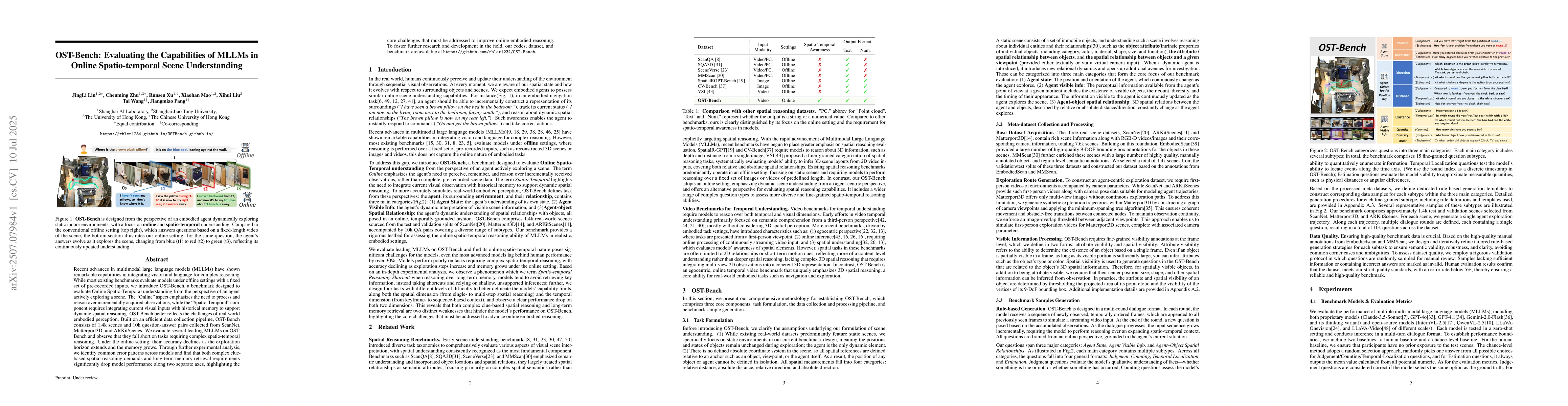 Recent advances in multimodal large language models (MLLMs) have shown remarkable capabilities in integrating vision and language for complex reasoning. While most existing benchmarks evaluate models under offline settings with a fixed set of pre-recorded inputs, we introduce OST-Bench, a benchmark designed to evaluate Online Spatio-Temporal understanding from the perspective of an agent actively exploring a scene. The Online aspect emphasizes the need to process and reason over incrementally acquired observations, while the Spatio-Temporal component requires integrating current visual inputs with historical memory to support dynamic spatial reasoning. OST-Bench better reflects the challenges of real-world embodied perception. Built on an efficient data collection pipeline, OST-Bench consists of 1.4k scenes and 10k question-answer pairs collected from ScanNet, Matterport3D, and ARKitScenes. We evaluate several leading MLLMs on OST-Bench and observe that they fall short on tasks requiring complex spatio-temporal reasoning. Under the online setting, their accuracy declines as the exploration horizon extends and the memory grows. Through further experimental analysis, we identify common error patterns across models and find that both complex clue-based spatial reasoning demands and long-term memory retrieval requirements significantly drop model performance along two separate axes, highlighting the core challenges that must be addressed to improve online embodied reasoning. To foster further research and development in the field, our codes, dataset, and benchmark are available. Our project page is: https://rbler1234.github.io/OSTBench.github.io/