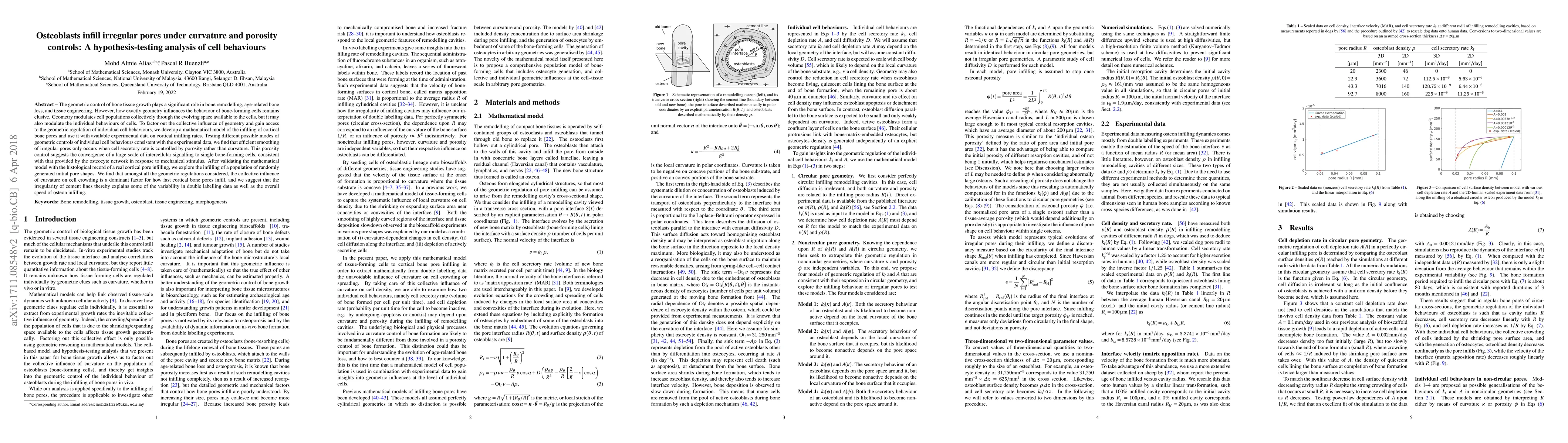 The geometric control of bone tissue growth plays a significant role in bone remodelling, age-related bone loss, and tissue engineering. However, how exactly geometry influences the behaviour of bone-forming cells remains elusive. Geometry modulates cell populations collectively through the evolving space available to the cells, but it may also modulate the individual behaviours of cells. To factor out the collective influence of geometry and gain access to the geometric regulation of individual cell behaviours, we develop a mathematical model of the infilling of cortical bone pores and use it with available experimental data on cortical infilling rates. Testing different possible modes of geometric controls of individual cell behaviours consistent with the experimental data, we find that efficient smoothing of irregular pores only occurs when cell secretory rate is controlled by porosity rather than curvature. This porosity control suggests the convergence of a large scale of intercellular signalling to single bone-forming cells, consistent with that provided by the osteocyte network in response to mechanical stimulus. After validating the mathematical model with the histological record of a real cortical pore infilling, we explore the infilling of a population of randomly generated initial pore shapes. We find that amongst all the geometric regulations considered, the collective influence of curvature on cell crowding is a dominant factor for how fast cortical bone pores infill, and we suggest that the irregularity of cement lines thereby explains some of the variability in double labelling data as well as the overall speed of osteon infilling.