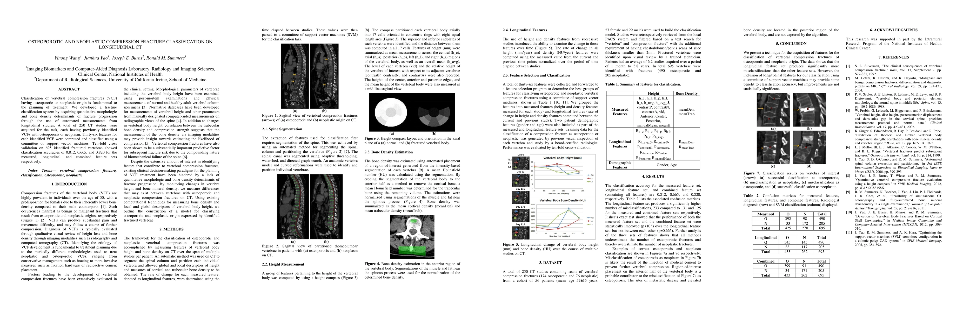This study developed a classification system for osteoporotic and neoplastic vertebral compression fractures using automated measurements from longitudinal CT studies. The system achieved high classification accuracy, distinguishing between fracture origins with accuracies of 0.812, 0.665, and 0.820 for measured, longitudinal, and combined feature sets respectively.