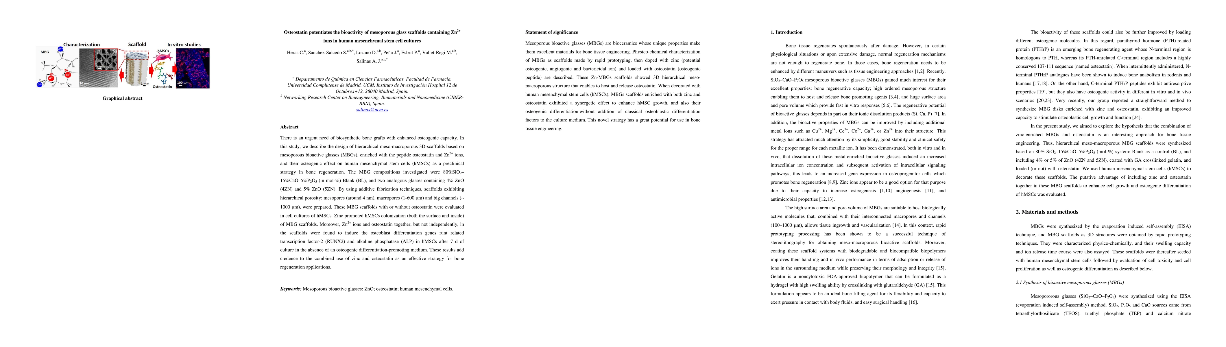 This study designed mesoporous bioactive glass scaffolds enriched with osteostatin and Zn2+ ions to enhance osteogenic capacity in human mesenchymal stem cells. The scaffolds promoted hMSC colonization and induced osteoblast differentiation genes RUNX2 and ALP, suggesting the combined use of zinc and osteostatin is effective for bone regeneration.