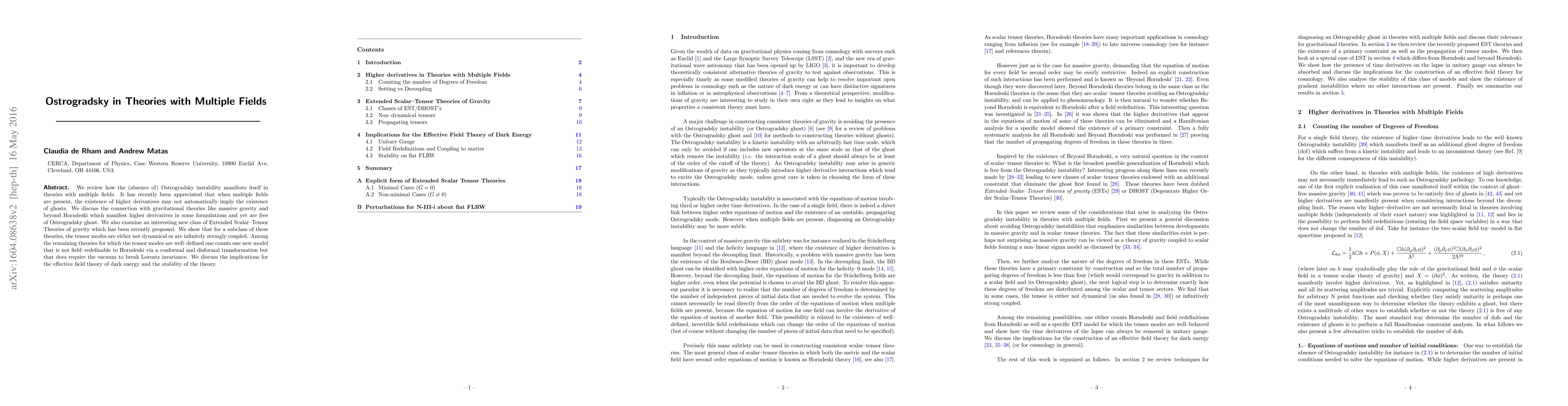 We review how the (absence of) Ostrogradsky instability manifests itself in theories with multiple fields. It has recently been appreciated that when multiple fields are present, the existence of higher derivatives may not automatically imply the existence of ghosts. We discuss the connection with gravitational theories like massive gravity and beyond Horndeski which manifest higher derivatives in some formulations and yet are free of Ostrogradsky ghost. We also examine an interesting new class of Extended Scalar-Tensor Theories of gravity which has been recently proposed. We show that for a subclass of these theories, the tensor modes are either not dynamical or are infinitely strongly coupled. Among the remaining theories for which the tensor modes are well-defined one counts one new model that is not field-redefinable to Horndeski via a conformal and disformal transformation but that does require the vacuum to break Lorentz invariance. We discuss the implications for the effective field theory of dark energy and the stability of the theory.