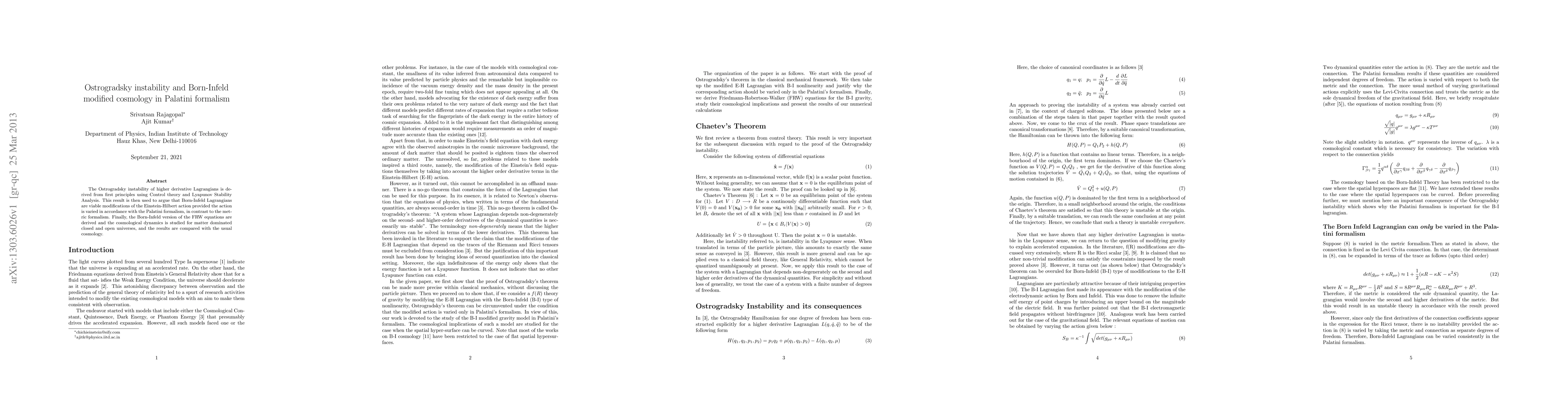 The Ostrogradsky instability of higher derivative Lagrangians is derived from first principles using Control theory and Lyapunov Stability Analysis. This result is then used to argue that Born-Infeld Lagrangians are viable modifications of the Einstein-Hilbert action provided the action is varied in accordance with the Palatini formalism, in contrast to the metric formalism. Finally, the Born-Infeld version of the FRW equations are derived and the cosmological dynamics is studied for matter dominated closed and open universes, and the results are compared with the usual cosmology.