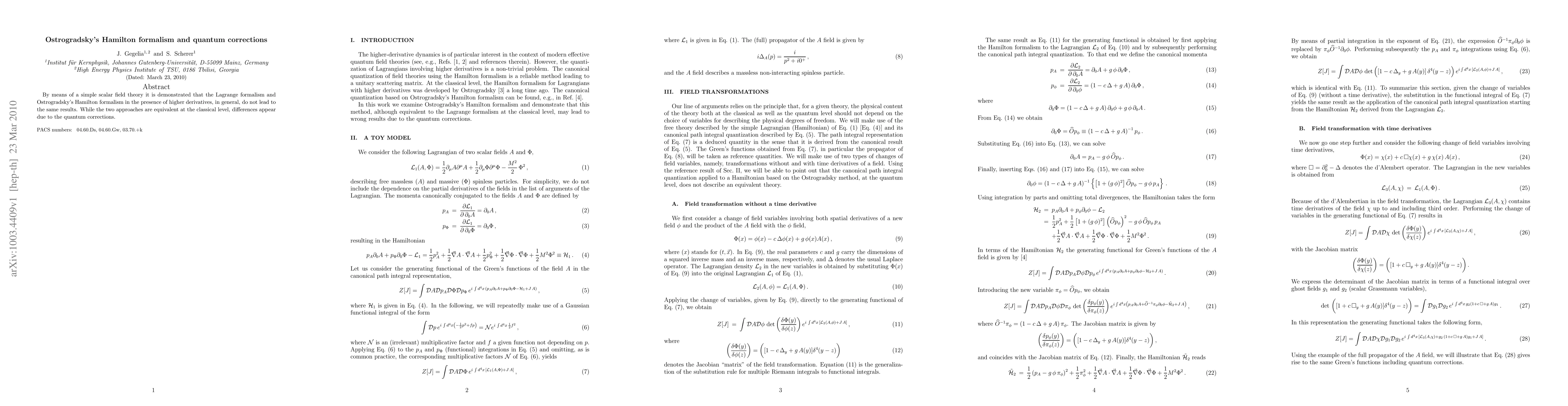 Summary: This paper shows that Ostrogradsky's Hamilton formalism and the standard Lagrange formalism yield different results in scalar field theories with higher derivatives, due to discrepancies arising from quantum corrections, despite their equivalence at the classical level.