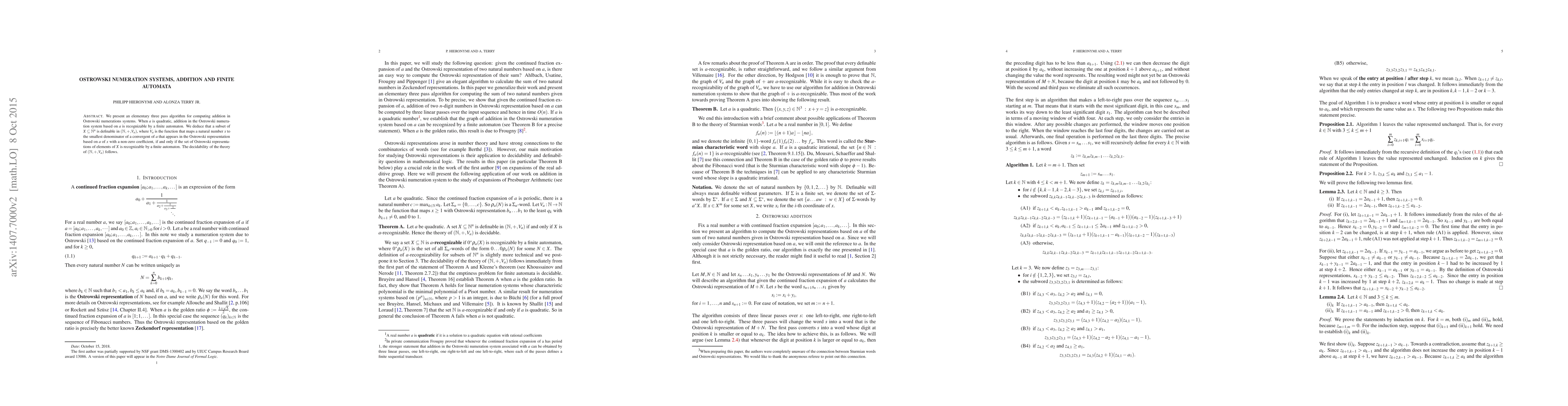 We present an elementary three pass algorithm for computing addition in Ostrowski numeration systems. When $a$ is quadratic, addition in the Ostrowski numeration system based on $a$ is recognizable by a finite automaton. We deduce that a subset of $X\subseteq \mathbb{N}^n$ is definable in $(\mathbb{N},+,V_a)$, where $V_a$ is the function that maps a natural number $x$ to the smallest denominator of a convergent of $a$ that appears in the Ostrowski representation based on $a$ of $x$ with a non-zero coefficient, if and only if the set of Ostrowski representations of elements of $X$ is recognizable by a finite automaton. The decidability of the theory of $(\mathbb{N},+,V_a)$ follows.