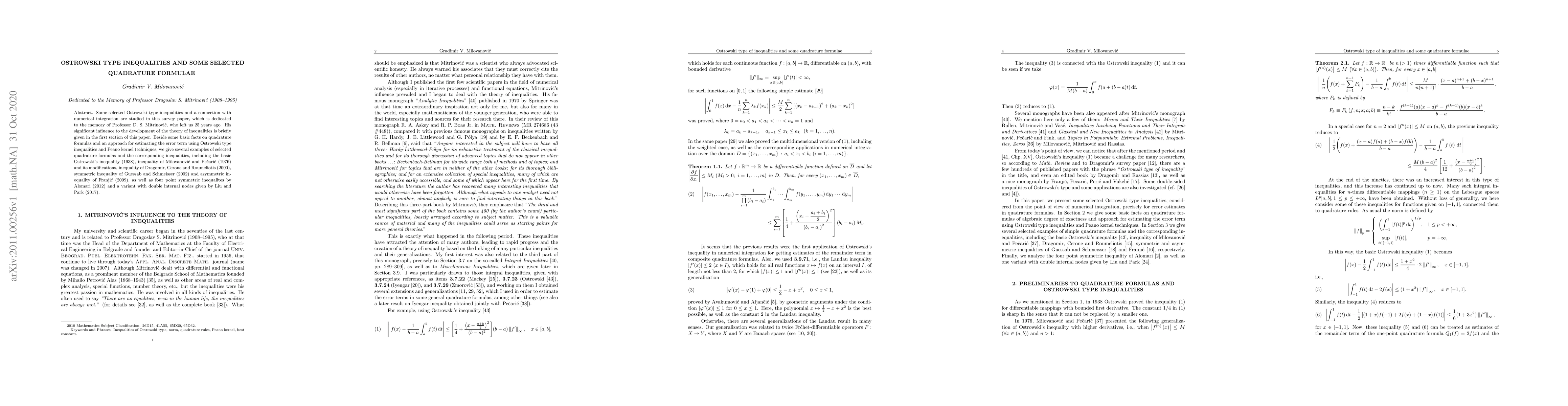 This paper surveys Ostrowski type inequalities and their application in numerical integration, highlighting their connection to selected quadrature formulae. It also pays tribute to the influential work of Professor D.S. Mitrinovic in the field of inequalities.