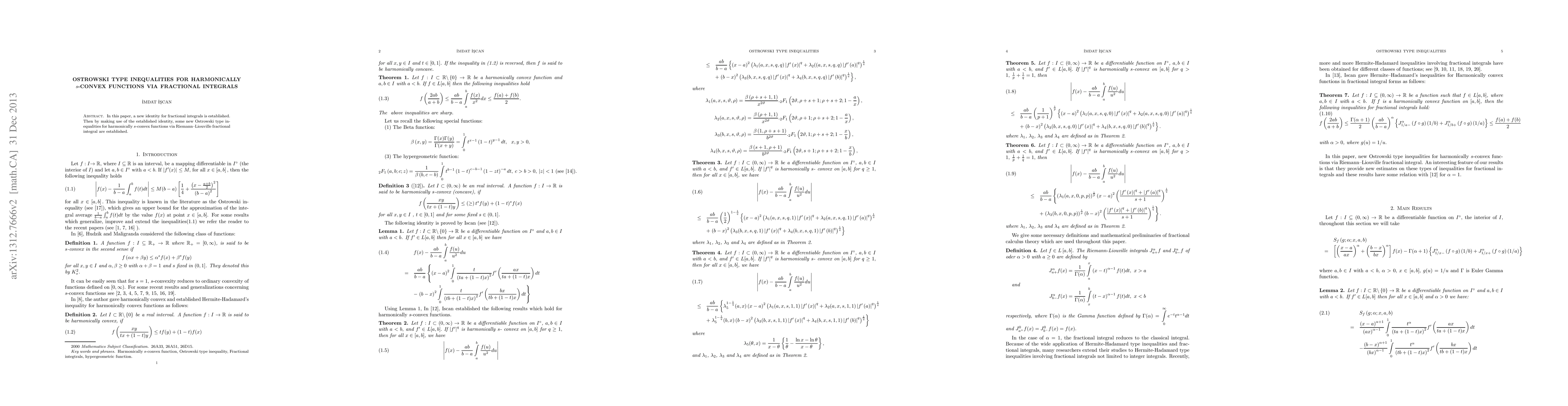Summary: This paper establishes a new identity for fractional integrals and utilizes it to derive new Ostrowski type inequalities for harmonically s-convex functions using Riemann-Liouville fractional integrals.