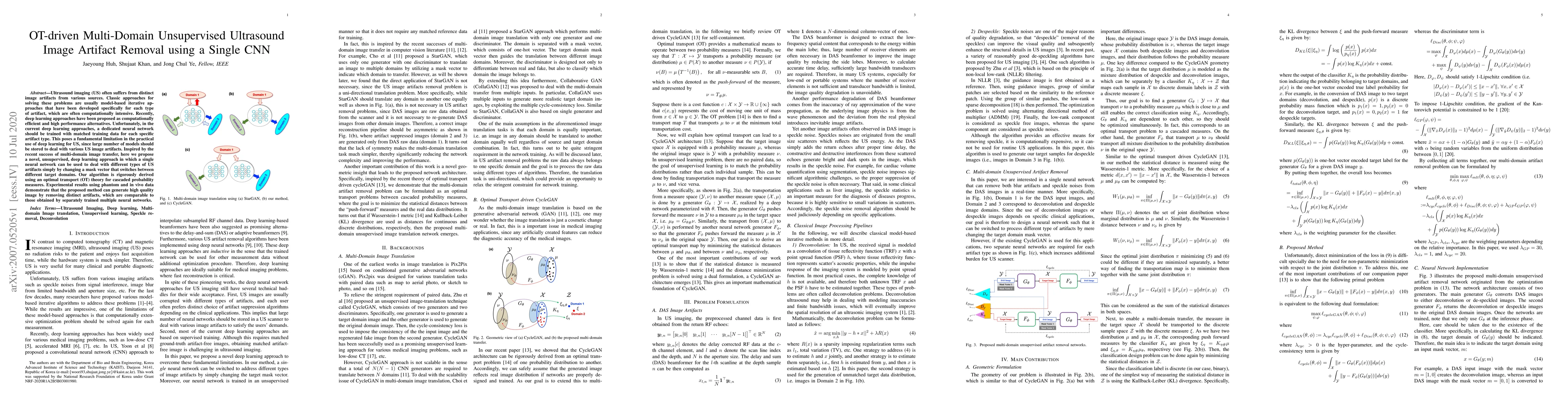 Ultrasound imaging (US) often suffers from distinct image artifacts from various sources. Classic approaches for solving these problems are usually model-based iterative approaches that have been developed specifically for each type of artifact, which are often computationally intensive. Recently, deep learning approaches have been proposed as computationally efficient and high performance alternatives. Unfortunately, in the current deep learning approaches, a dedicated neural network should be trained with matched training data for each specific artifact type. This poses a fundamental limitation in the practical use of deep learning for US, since large number of models should be stored to deal with various US image artifacts. Inspired by the recent success of multi-domain image transfer, here we propose a novel, unsupervised, deep learning approach in which a single neural network can be used to deal with different types of US artifacts simply by changing a mask vector that switches between different target domains. Our algorithm is rigorously derived using an optimal transport (OT) theory for cascaded probability measures. Experimental results using phantom and in vivo data demonstrate that the proposed method can generate high quality image by removing distinct artifacts, which are comparable to those obtained by separately trained multiple neural networks.