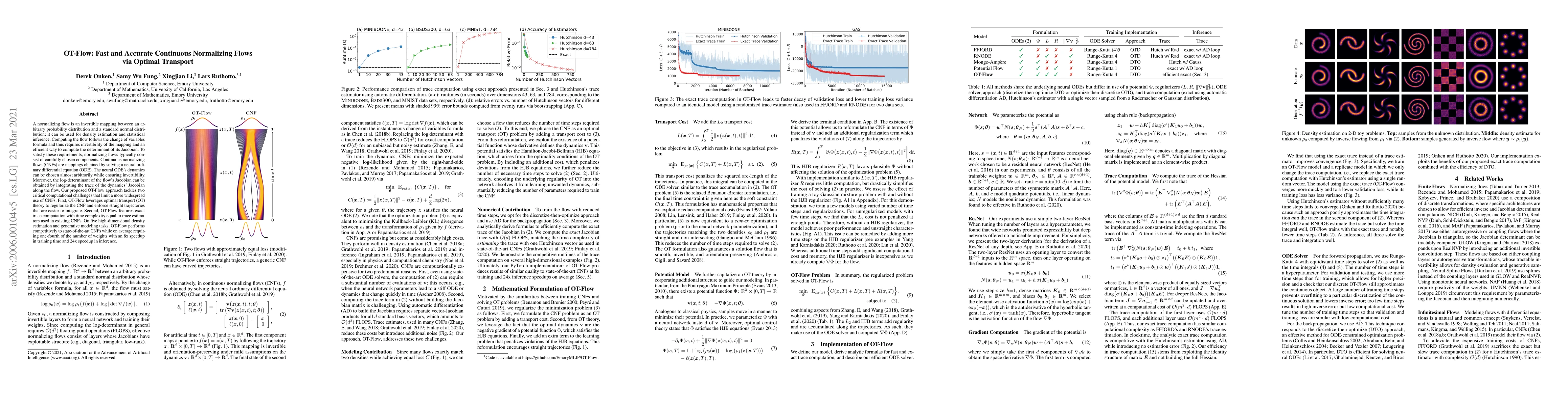 OT-Flow utilizes optimal transport theory to regularize continuous normalizing flows, achieving faster training and inference times while maintaining competitive performance on density estimation and generative modeling tasks. It enforces straight trajectories and exact trace computation, resulting in a significant reduction in computational complexity.