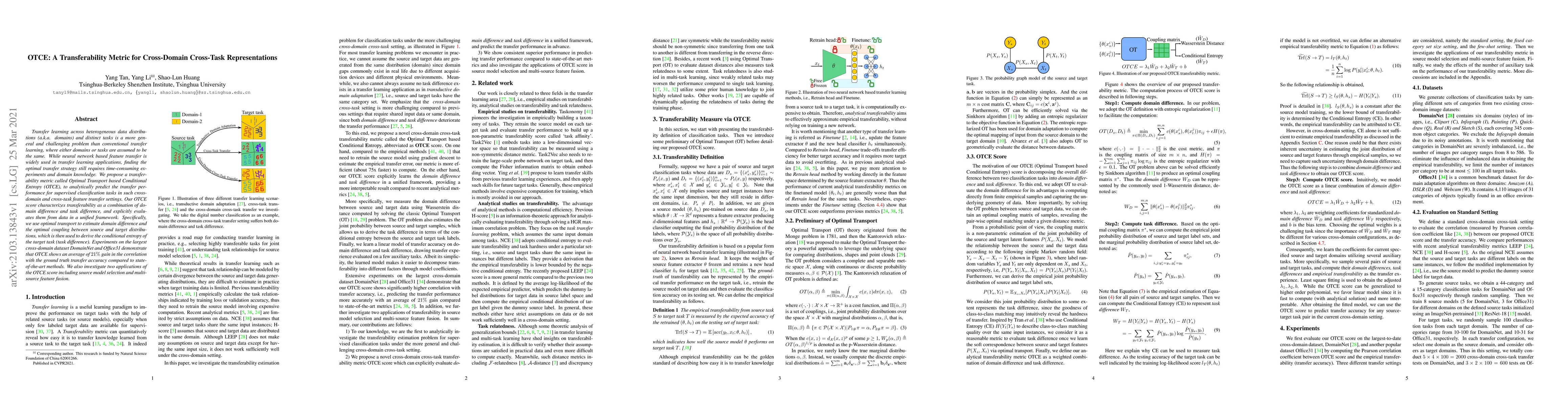 Transfer learning across heterogeneous data distributions (a.k.a. domains) and distinct tasks is a more general and challenging problem than conventional transfer learning, where either domains or tasks are assumed to be the same. While neural network based feature transfer is widely used in transfer learning applications, finding the optimal transfer strategy still requires time-consuming experiments and domain knowledge. We propose a transferability metric called Optimal Transport based Conditional Entropy (OTCE), to analytically predict the transfer performance for supervised classification tasks in such cross-domain and cross-task feature transfer settings. Our OTCE score characterizes transferability as a combination of domain difference and task difference, and explicitly evaluates them from data in a unified framework. Specifically, we use optimal transport to estimate domain difference and the optimal coupling between source and target distributions, which is then used to derive the conditional entropy of the target task (task difference). Experiments on the largest cross-domain dataset DomainNet and Office31 demonstrate that OTCE shows an average of 21% gain in the correlation with the ground truth transfer accuracy compared to state-of-the-art methods. We also investigate two applications of the OTCE score including source model selection and multi-source feature fusion.