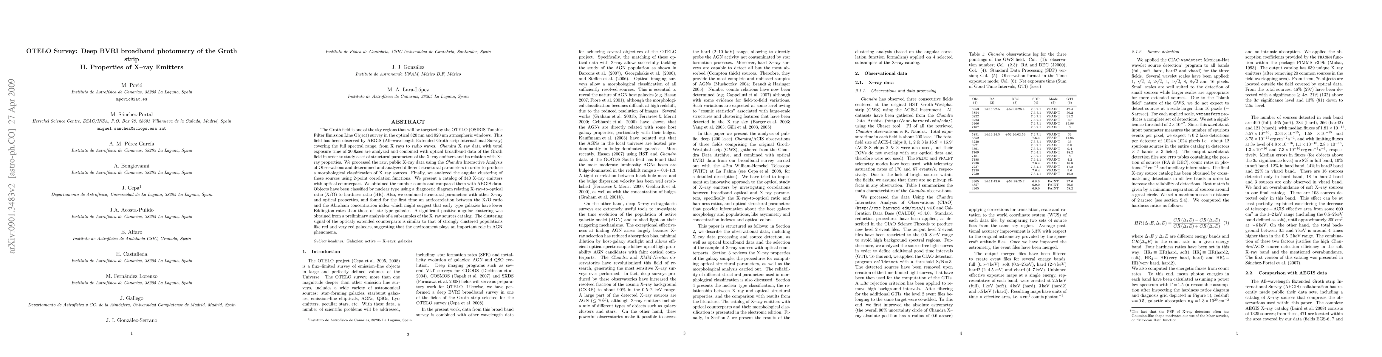 The Groth field is one of the sky regions that will be targeted by the OTELO (OSIRIS Tunable Filter Emission Line Object) survey in the optical 820 nm and 920 nm atmospheric windows. This field has been observed by AEGIS (All-wavelength Extended Groth strip International Survey) covering the full spectral range, from X-rays to radio waves. Chandra X-ray data with total exposure time of 200ksec are analyzed and combined with optical broadband data of the Groth field in order to study a set of structural parameters of the X-ray emitters and its relation with X-ray properties. We processed the raw, public X-ray data using the Chandra Interactive Analysis of Observations and determined and analyzed different structural parameters in order to produce a morphological classification of X-ray sources. Finally, we analyzed the angular clustering of these sources using 2-point correlation functions. We present a catalog of 340 X-ray emitters with optical counterpart. We obtained the number counts and compared them with AEGIS data. Objects have been classified by nuclear type using a diagnostic diagram relating X-ray-to-optical ratio (X/O) to hardness ratio (HR). Also, we combined structural parameters with other X-ray and optical properties, and found for the first time an anticorrelation between the X/O ratio and the Abraham concentration index which might suggest that early type galaxies have lower Eddington rates than those of late type galaxies. A significant positive angular clustering was obtained from a preliminary analysis of 4 subsamples of the X-ray sources catalog. The clustering signal of the opticaly extended counterparts is similar to that of strongly clustered populations like red and very red galaxies, suggesting that the environment plays an important role in AGN phenomena.