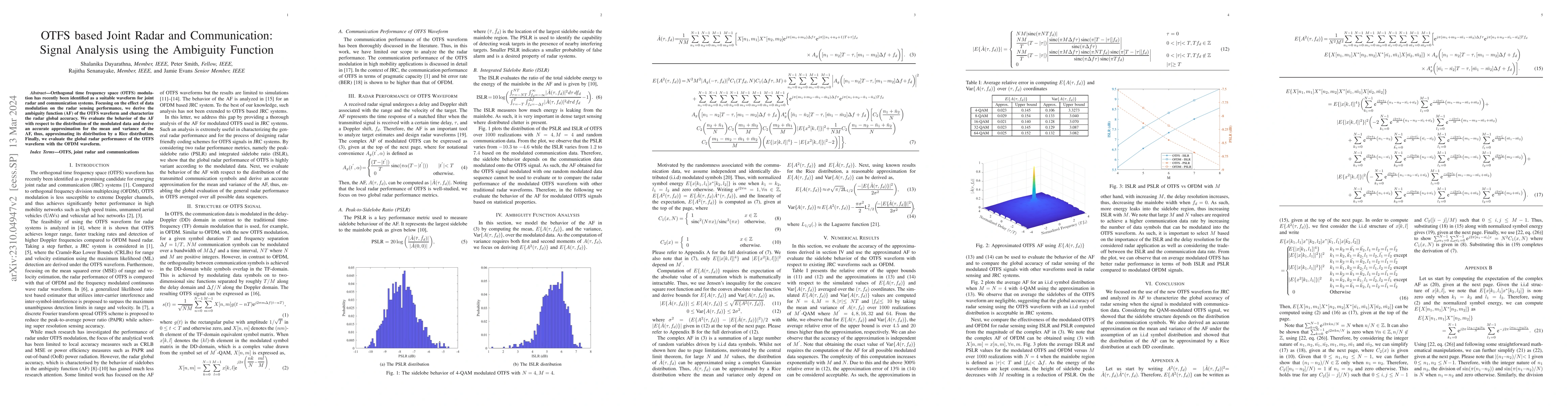 This paper explores OTFS modulation for joint radar and communication systems, deriving the ambiguity function to analyze radar sensing performance. It characterizes radar accuracy and evaluates the behavior of the ambiguity function concerning modulated data, approximating its distribution with a Rice distribution for better performance evaluation compared to OFDM waveforms.