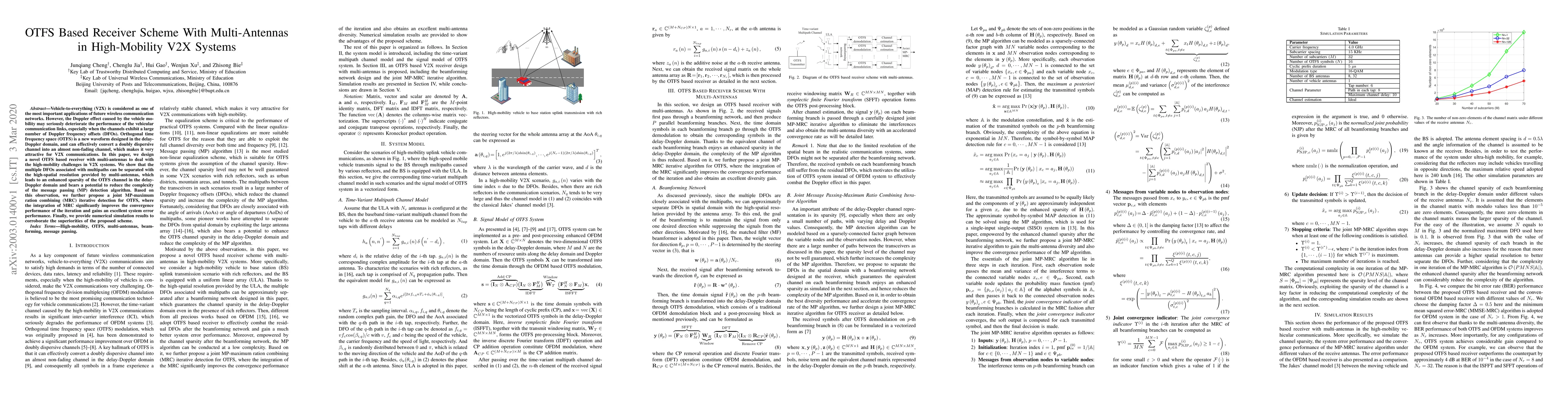 Vehicle-to-everything (V2X) is considered as one of the most important applications of future wireless communication networks. However, the Doppler effect caused by the vehicle mobility may seriously deteriorate the performance of the vehicular communication links, especially when the channels exhibit a large number of Doppler frequency offsets (DFOs). Orthogonal time frequency space (OTFS) is a new waveform designed in the delay-Doppler domain, and can effectively convert a doubly dispersive channel into an almost non-fading channel, which makes it very attractive for V2X communications. In this paper, we design a novel OTFS based receiver with multi-antennas to deal with the high-mobility challenges in V2X systems. We show that the multiple DFOs associated with multipaths can be separated with the high-spatial resolution provided by multi-antennas, which leads to an enhanced sparsity of the OTFS channel in the delay-Doppler domain and bears a potential to reduce the complexity of the message passing (MP) detection algorithm. Based on this observation, we further propose a joint MP-maximum ration combining (MRC) iterative detection for OTFS, where the integration of MRC significantly improves the convergence performance of the iteration and gains an excellent system error performance. Finally, we provide numerical simulation results to corroborate the superiorities of the proposed scheme.