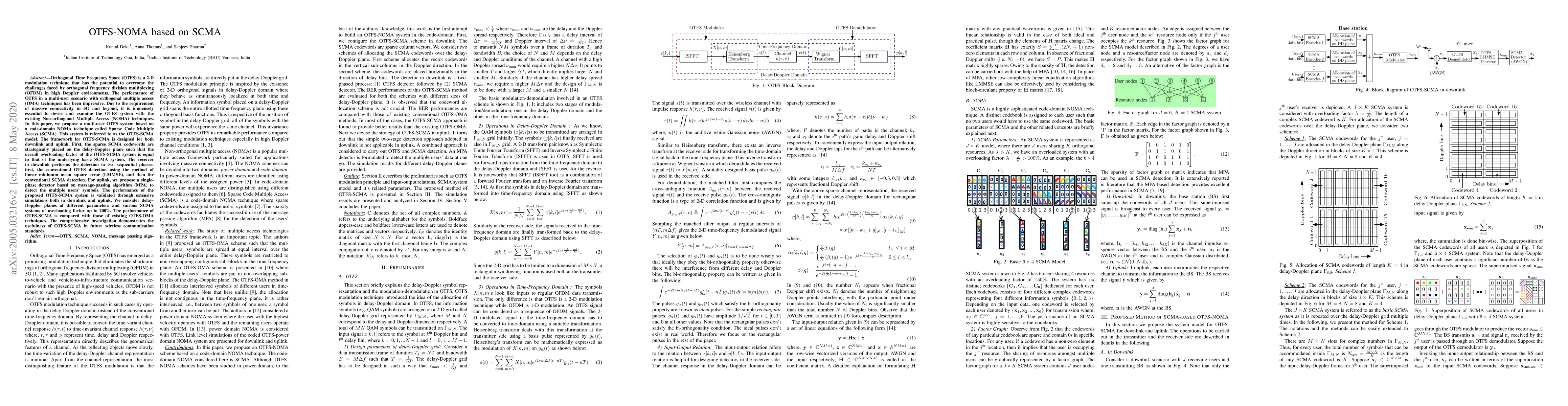 The paper proposes an OTFS-NOMA system based on SCMA, designed for both downlink and uplink. It involves strategic placement of sparse SCMA codewords on the delay-Doppler plane, ensuring the overloading factor matches the underlying SCMA system. Downlink detection uses LMMSE followed by SCMA detection, while uplink uses a single-phase MPA detector.