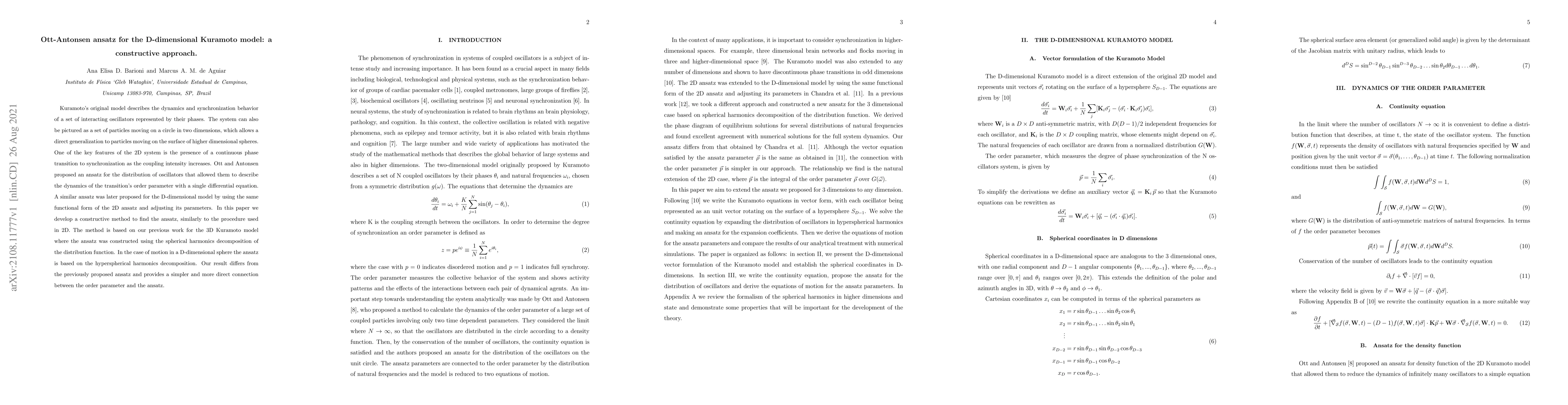 Kuramoto's original model describes the dynamics and synchronization behavior of a set of interacting oscillators represented by their phases. The system can also be pictured as a set of particles moving on a circle in two dimensions, which allows a direct generalization to particles moving on the surface of higher dimensional spheres. One of the key features of the 2D system is the presence of a continuous phase transition to synchronization as the coupling intensity increases. Ott and Antonsen proposed an ansatz for the distribution of oscillators that allowed them to describe the dynamics of the transition's order parameter with a single differential equation. A similar ansatz was later proposed for the D-dimensional model by using the same functional form of the 2D ansatz and adjusting its parameters. In this paper we develop a constructive method to find the ansatz, similarly to the procedure used in 2D. The method is based on our previous work for the 3D Kuramoto model where the ansatz was constructed using the spherical harmonics decomposition of the distribution function. In the case of motion in a D-dimensional sphere the ansatz is based on the hyperspherical harmonics decomposition. Our result differs from the previously proposed ansatz and provides a simpler and more direct connection between the order parameter and the ansatz.