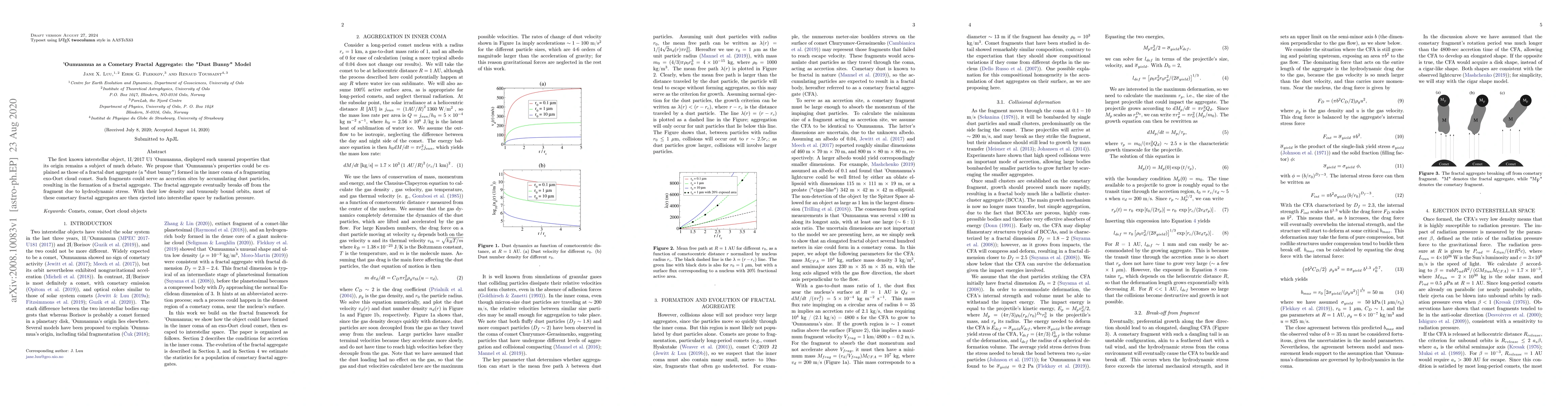 The paper proposes that 'Oumuamua's unusual properties can be explained by it being a fractal dust aggregate formed in the inner coma of a fragmenting comet, eventually ejected into interstellar space due to radiation pressure. This "dust bunny" model suggests that such aggregates could be common interstellar objects.