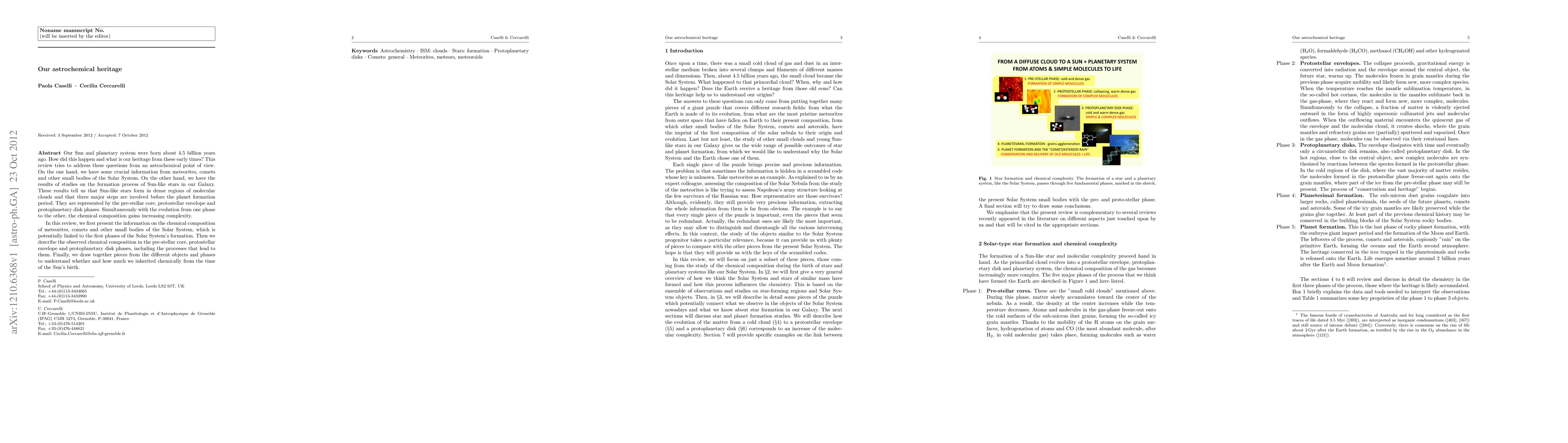 Our Sun and planetary system were born about 4.5 billion years ago. How did this happen and what is our heritage from these early times? This review tries to address these questions from an astrochemical point of view. On the one hand, we have some crucial information from meteorites, comets and other small bodies of the Solar System. On the other hand, we have the results of studies on the formation process of Sun-like stars in our Galaxy. These results tell us that Sun-like stars form in dense regions of molecular clouds and that three major steps are involved before the planet formation period. They are represented by the pre-stellar core, protostellar envelope and protoplanetary disk phases. Simultaneously with the evolution from one phase to the other, the chemical composition gains increasing complexity. In this review, we first present the information on the chemical composition of meteorites, comets and other small bodies of the Solar System, which is potentially linked to the first phases of the Solar System's formation. Then we describe the observed chemical composition in the pre-stellar core, protostellar envelope and protoplanetary disk phases, including the processes that lead to them. Finally, we draw together pieces from the different objects and phases to understand whether and how much we inherited chemically from the time of the Sun's birth.