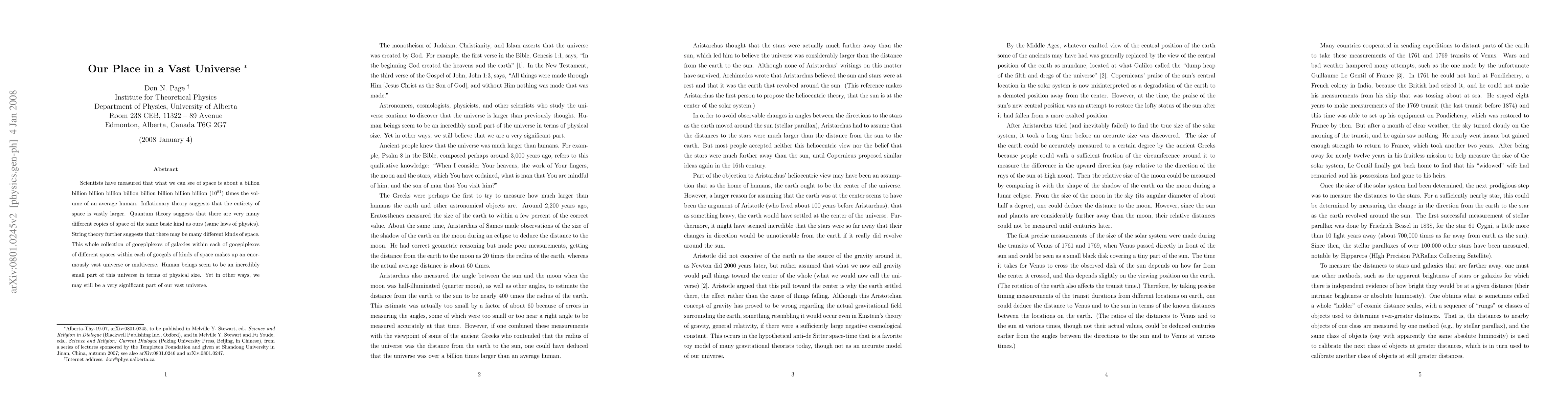 This paper explores the immense scale of the universe, noting that visible space is 10^81 times the volume of an average human. It discusses theories suggesting an even larger, potentially infinite universe, including multiverses and different kinds of space, highlighting humanity's small physical presence but significant potential role within this vast cosmos.