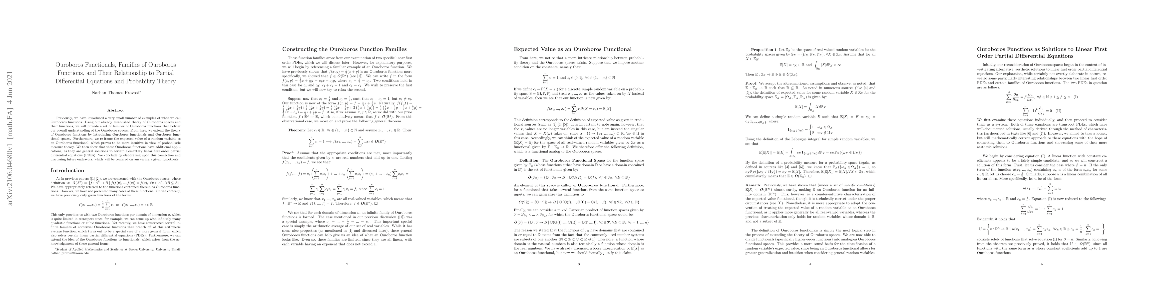 Previously, we have introduced a very small number of examples of what we call Ouroboros functions. Using our already established theory of Ouroboros spaces and their functions, we will provide a set of families of Ouroboros functions that bolster our overall understanding of the Ouroboros spaces. From here, we extend the theory of Ouroboros functions by introducing Ouroboros functionals and Ouroboros functional spaces. Furthermore, we re-frame the expected value of a random variable as an Ouroboros functional, which proves to be more intuitive in view of probabilistic measure theory. We then show that these Ouroboros functions have additional applications, as they are general solutions to certain elementary linear first order partial differential equations (PDEs). We conclude by elaborating upon this connection and discussing future endeavors, which will be centered on answering a given hypothesis.