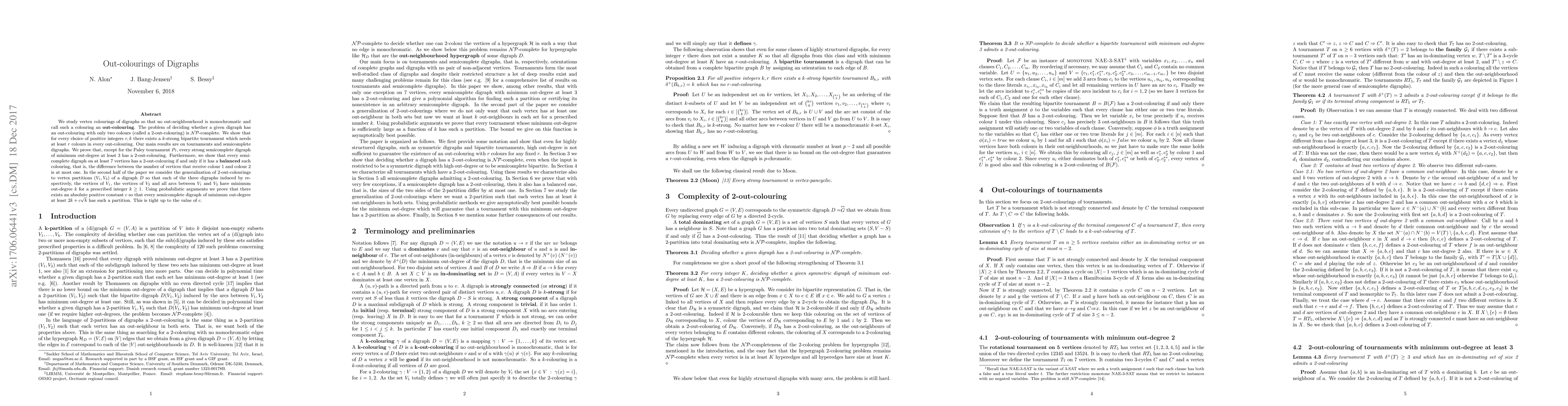 This paper investigates vertex colourings of digraphs where no out-neighbourhood is monochromatic, termed out-colourings. It proves that determining a 2-out-colouring is NP-complete and shows that strong bipartite tournaments require at least $r$ colours for any $r$. The study concludes that most strong semicomplete digraphs have a 2-out-colouring, except for the Paley tournament $P_7$, and explores generalisations to vertex partitions with specific out-degree conditions.