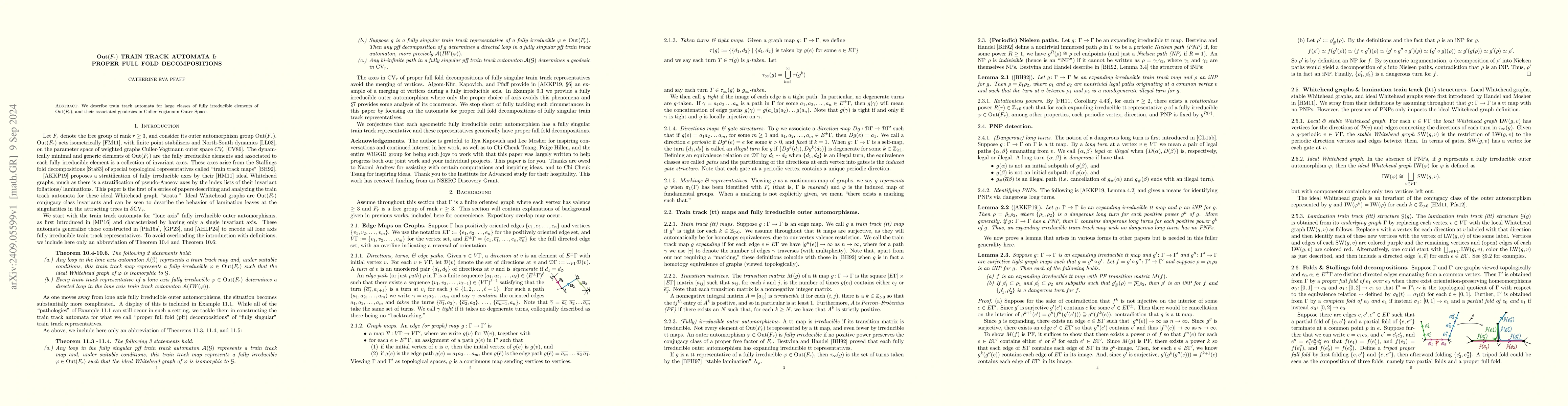 Summary: This paper introduces train track automata for fully irreducible elements in Out($F_r$), detailing their proper full fold decompositions and associated geodesics in Culler-Vogtmann Outer Space. The methodology provides a new framework for understanding these elements' behavior.