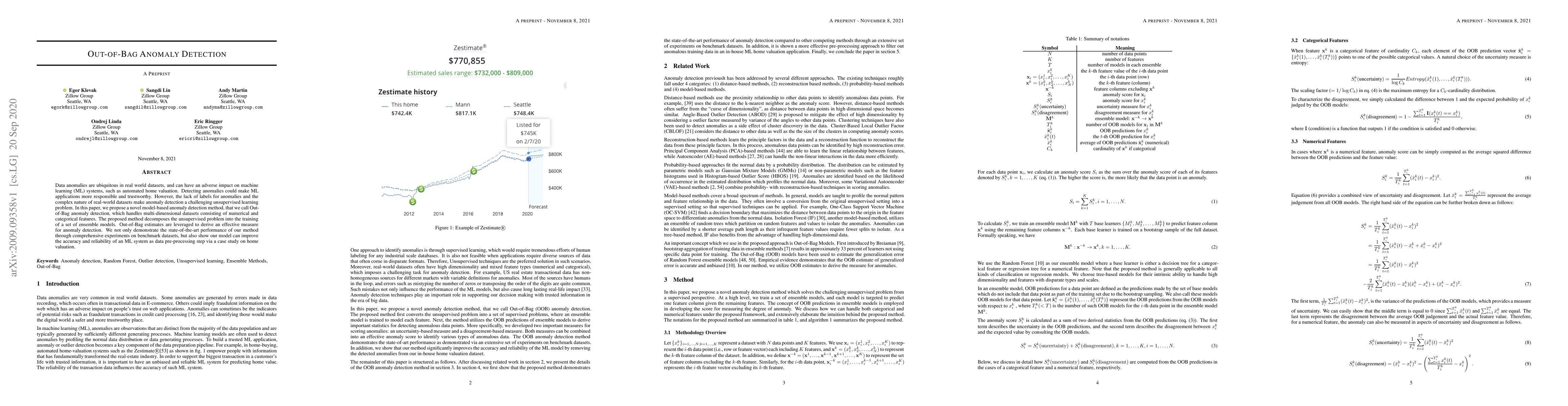Data anomalies are ubiquitous in real world datasets, and can have an adverse impact on machine learning (ML) systems, such as automated home valuation. Detecting anomalies could make ML applications more responsible and trustworthy. However, the lack of labels for anomalies and the complex nature of real-world datasets make anomaly detection a challenging unsupervised learning problem. In this paper, we propose a novel model-based anomaly detection method, that we call Out-of- Bag anomaly detection, which handles multi-dimensional datasets consisting of numerical and categorical features. The proposed method decomposes the unsupervised problem into the training of a set of ensemble models. Out-of-Bag estimates are leveraged to derive an effective measure for anomaly detection. We not only demonstrate the state-of-the-art performance of our method through comprehensive experiments on benchmark datasets, but also show our model can improve the accuracy and reliability of an ML system as data pre-processing step via a case study on home valuation.