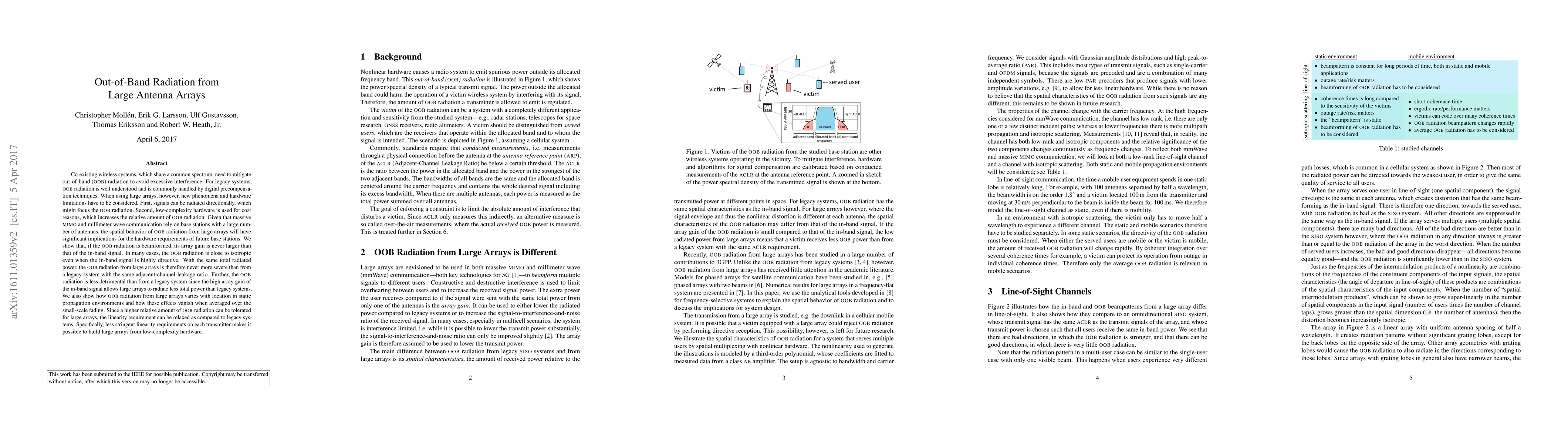 This paper investigates out-of-band radiation from large antenna arrays used in wireless systems, showing that despite increased OOB radiation due to directional signal radiation and low-complexity hardware, the overall impact is less severe than in legacy systems. The study concludes that large arrays can tolerate higher OOB radiation levels, allowing for less stringent linearity requirements and the use of simpler hardware.