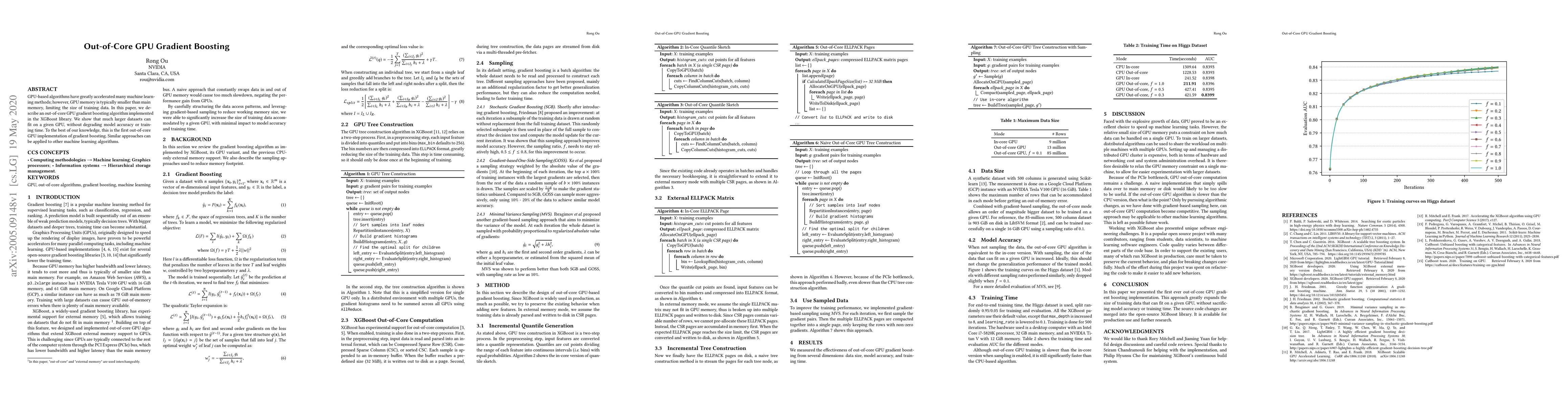 This paper presents an out-of-core GPU gradient boosting algorithm within the XGBoost library, enabling larger datasets to fit on GPUs without compromising model accuracy or training time, marking the first such implementation for gradient boosting. This approach can potentially extend to other machine learning algorithms.