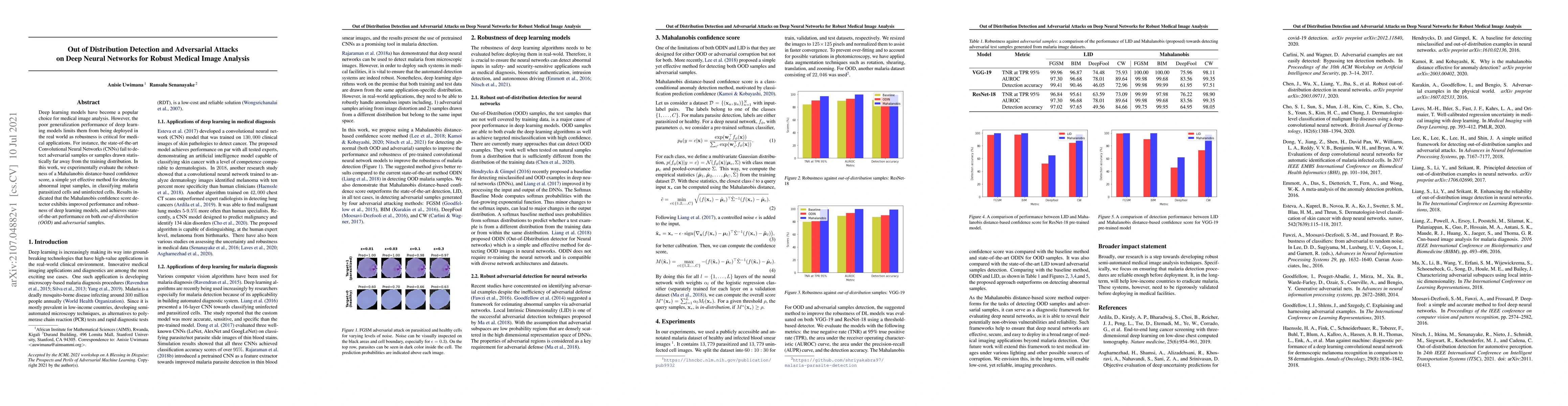 This paper investigates the robustness of deep neural networks for medical image analysis, focusing on detecting out-of-distribution and adversarial samples. The study finds that a Mahalanobis distance-based confidence score method effectively improves the robustness of CNNs, achieving state-of-the-art performance in classifying malaria cells.