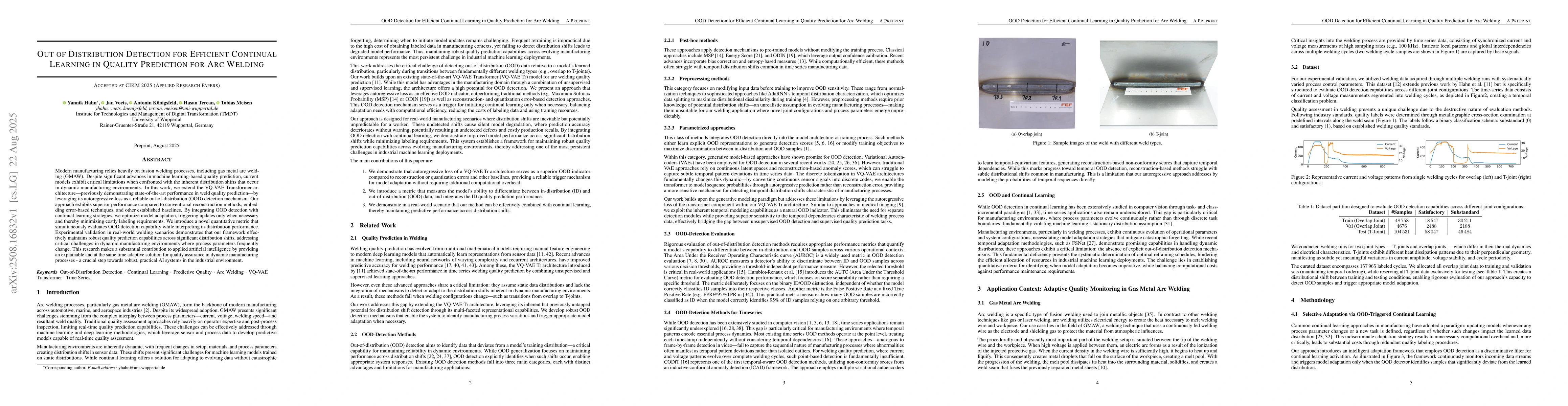 Modern manufacturing relies heavily on fusion welding processes, including gas metal arc welding (GMAW). Despite significant advances in machine learning-based quality prediction, current models exhibit critical limitations when confronted with the inherent distribution shifts that occur in dynamic manufacturing environments. In this work, we extend the VQ-VAE Transformer architecture - previously demonstrating state-of-the-art performance in weld quality prediction - by leveraging its autoregressive loss as a reliable out-of-distribution (OOD) detection mechanism. Our approach exhibits superior performance compared to conventional reconstruction methods, embedding error-based techniques, and other established baselines. By integrating OOD detection with continual learning strategies, we optimize model adaptation, triggering updates only when necessary and thereby minimizing costly labeling requirements. We introduce a novel quantitative metric that simultaneously evaluates OOD detection capability while interpreting in-distribution performance. Experimental validation in real-world welding scenarios demonstrates that our framework effectively maintains robust quality prediction capabilities across significant distribution shifts, addressing critical challenges in dynamic manufacturing environments where process parameters frequently change. This research makes a substantial contribution to applied artificial intelligence by providing an explainable and at the same time adaptive solution for quality assurance in dynamic manufacturing processes - a crucial step towards robust, practical AI systems in the industrial environment.