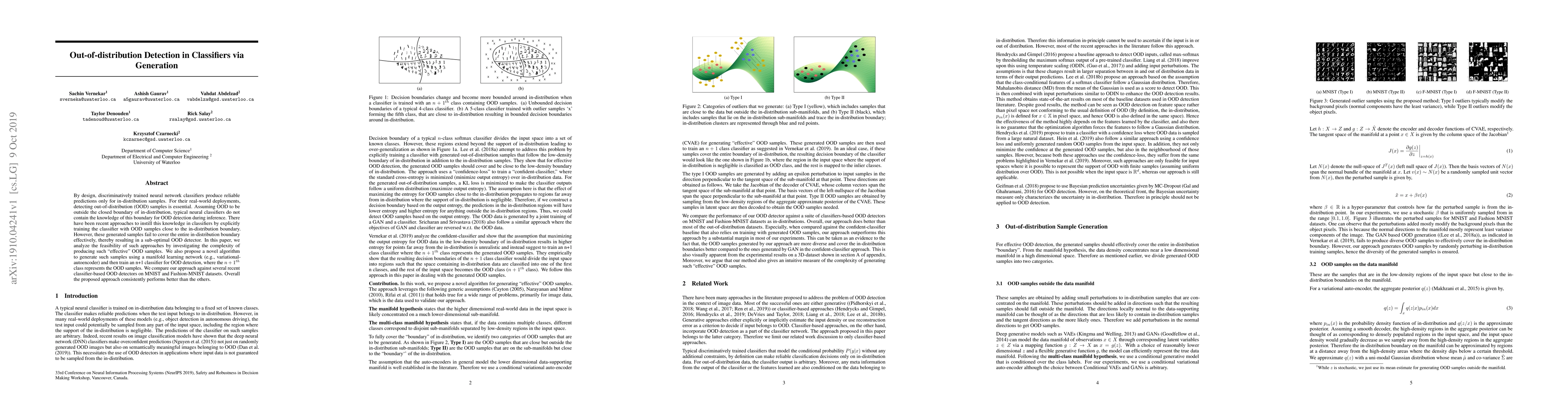 This paper proposes a novel method for generating effective out-of-distribution (OOD) samples using a manifold learning network, which trains a classifier with an additional class for OOD detection. The approach outperforms existing OOD detection methods on MNIST and Fashion-MNIST datasets.
