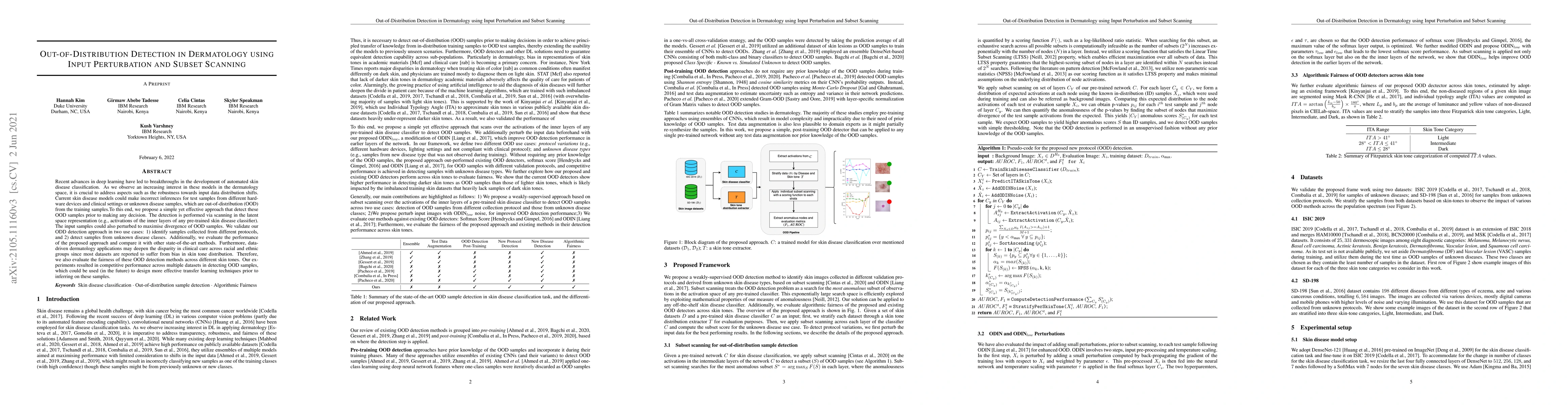 This paper proposes a method for detecting out-of-distribution samples in automated skin disease classification using input perturbation and latent space scanning. It evaluates the approach's effectiveness in identifying samples from different protocols and unknown disease classes, and assesses its fairness across different skin tones.