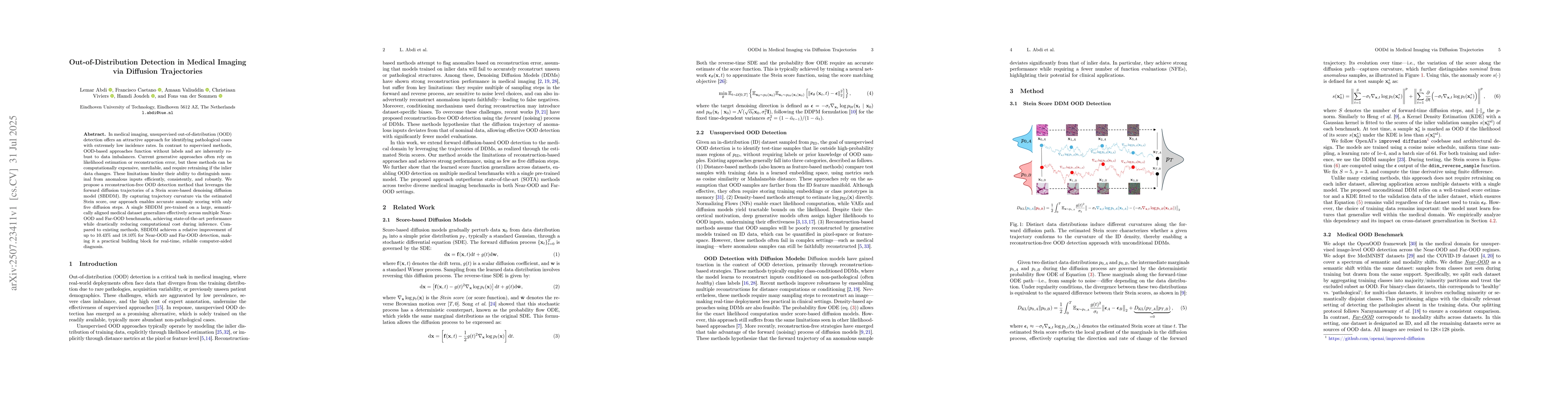 In medical imaging, unsupervised out-of-distribution (OOD) detection offers an attractive approach for identifying pathological cases with extremely low incidence rates. In contrast to supervised methods, OOD-based approaches function without labels and are inherently robust to data imbalances. Current generative approaches often rely on likelihood estimation or reconstruction error, but these methods can be computationally expensive, unreliable, and require retraining if the inlier data changes. These limitations hinder their ability to distinguish nominal from anomalous inputs efficiently, consistently, and robustly. We propose a reconstruction-free OOD detection method that leverages the forward diffusion trajectories of a Stein score-based denoising diffusion model (SBDDM). By capturing trajectory curvature via the estimated Stein score, our approach enables accurate anomaly scoring with only five diffusion steps. A single SBDDM pre-trained on a large, semantically aligned medical dataset generalizes effectively across multiple Near-OOD and Far-OOD benchmarks, achieving state-of-the-art performance while drastically reducing computational cost during inference. Compared to existing methods, SBDDM achieves a relative improvement of up to 10.43% and 18.10% for Near-OOD and Far-OOD detection, making it a practical building block for real-time, reliable computer-aided diagnosis.