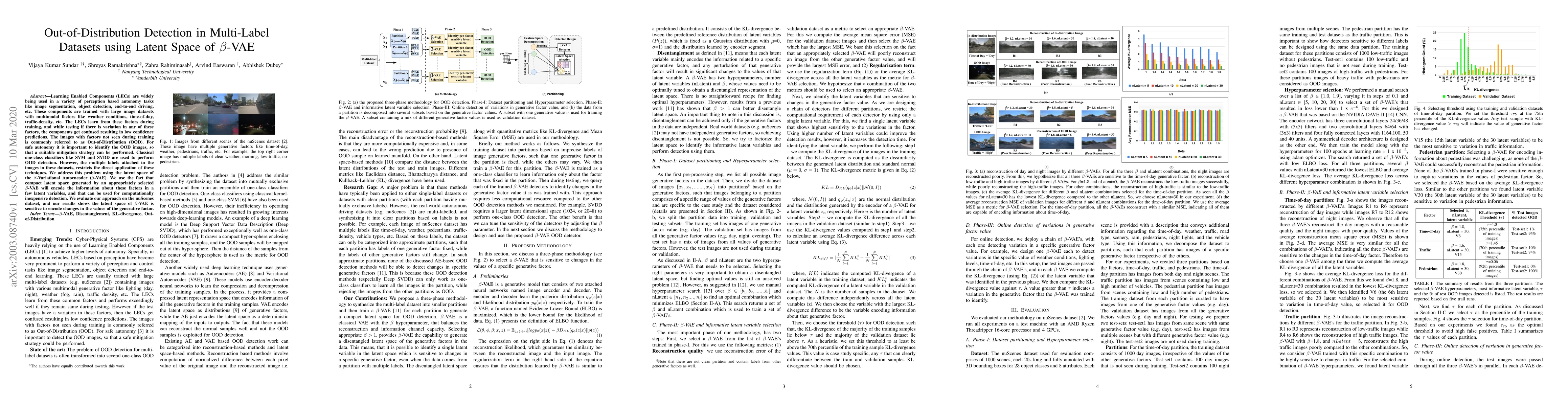 Learning Enabled Components (LECs) are widely being used in a variety of perception based autonomy tasks like image segmentation, object detection, end-to-end driving, etc. These components are trained with large image datasets with multimodal factors like weather conditions, time-of-day, traffic-density, etc. The LECs learn from these factors during training, and while testing if there is variation in any of these factors, the components get confused resulting in low confidence predictions. The images with factors not seen during training is commonly referred to as Out-of-Distribution (OOD). For safe autonomy it is important to identify the OOD images, so that a suitable mitigation strategy can be performed. Classical one-class classifiers like SVM and SVDD are used to perform OOD detection. However, the multiple labels attached to the images in these datasets, restricts the direct application of these techniques. We address this problem using the latent space of the $\beta$-Variational Autoencoder ($\beta$-VAE). We use the fact that compact latent space generated by an appropriately selected $\beta$-VAE will encode the information about these factors in a few latent variables, and that can be used for computationally inexpensive detection. We evaluate our approach on the nuScenes dataset, and our results shows the latent space of $\beta$-VAE is sensitive to encode changes in the values of the generative factor.