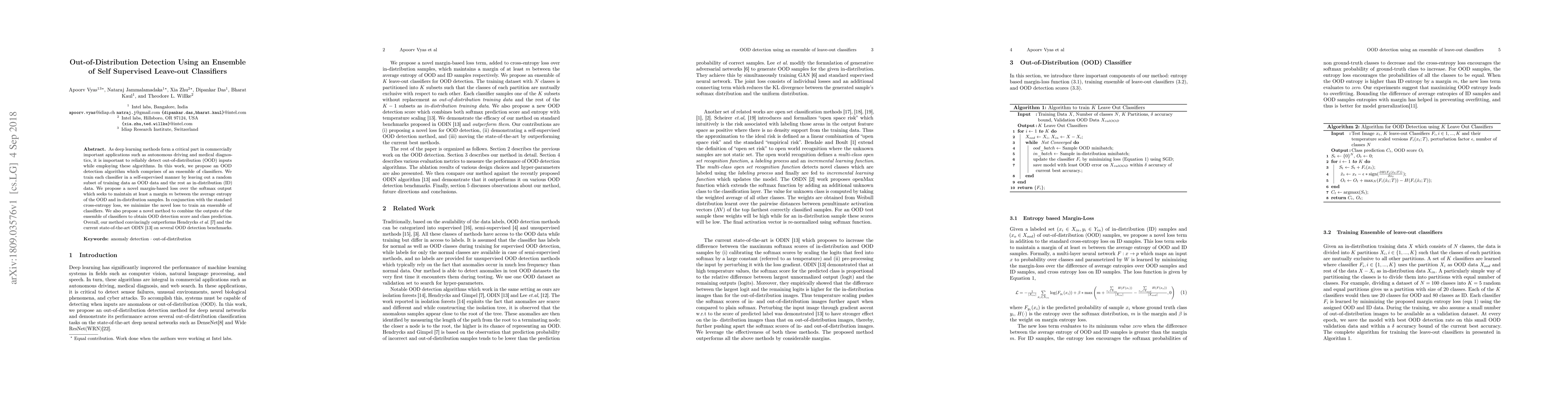 This paper proposes an ensemble of self-supervised leave-out classifiers for out-of-distribution detection in deep learning, using a margin-based loss to differentiate between in-distribution and out-of-distribution data. The method outperforms existing benchmarks, including ODIN, in detecting OOD inputs.
