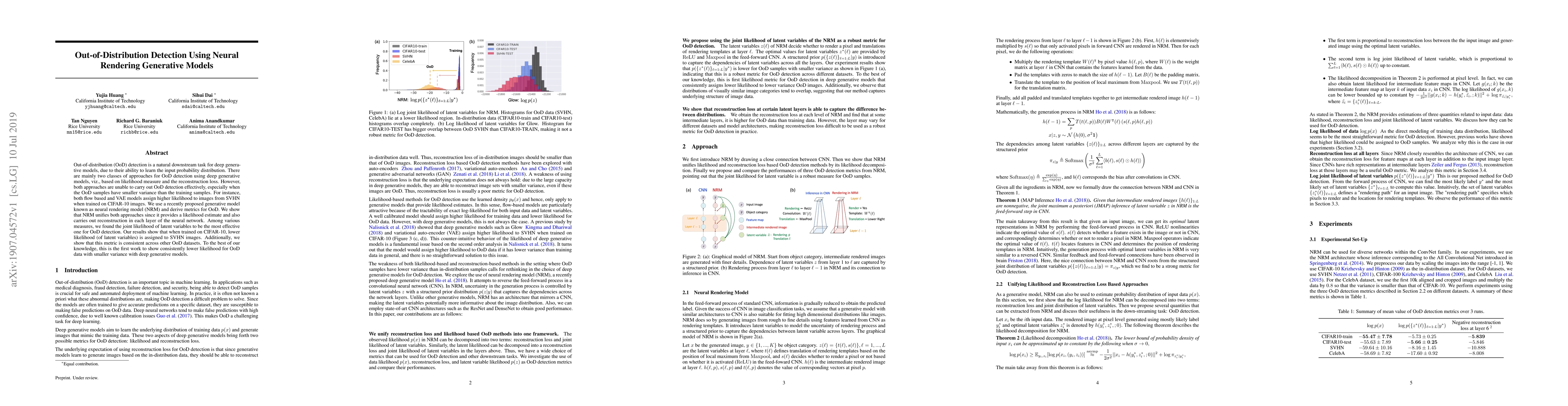 Out-of-distribution (OoD) detection is a natural downstream task for deep generative models, due to their ability to learn the input probability distribution. There are mainly two classes of approaches for OoD detection using deep generative models, viz., based on likelihood measure and the reconstruction loss. However, both approaches are unable to carry out OoD detection effectively, especially when the OoD samples have smaller variance than the training samples. For instance, both flow based and VAE models assign higher likelihood to images from SVHN when trained on CIFAR-10 images. We use a recently proposed generative model known as neural rendering model (NRM) and derive metrics for OoD. We show that NRM unifies both approaches since it provides a likelihood estimate and also carries out reconstruction in each layer of the neural network. Among various measures, we found the joint likelihood of latent variables to be the most effective one for OoD detection. Our results show that when trained on CIFAR-10, lower likelihood (of latent variables) is assigned to SVHN images. Additionally, we show that this metric is consistent across other OoD datasets. To the best of our knowledge, this is the first work to show consistently lower likelihood for OoD data with smaller variance with deep generative models.