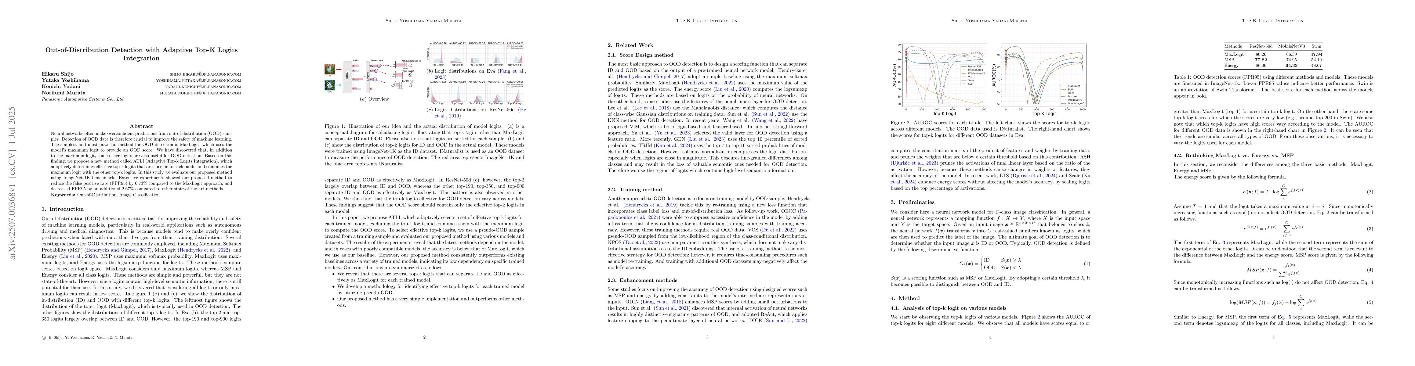 Neural networks often make overconfident predictions from out-of-distribution (OOD) samples. Detection of OOD data is therefore crucial to improve the safety of machine learning. The simplest and most powerful method for OOD detection is MaxLogit, which uses the model's maximum logit to provide an OOD score. We have discovered that, in addition to the maximum logit, some other logits are also useful for OOD detection. Based on this finding, we propose a new method called ATLI (Adaptive Top-k Logits Integration), which adaptively determines effective top-k logits that are specific to each model and combines the maximum logit with the other top-k logits. In this study we evaluate our proposed method using ImageNet-1K benchmark. Extensive experiments showed our proposed method to reduce the false positive rate (FPR95) by 6.73% compared to the MaxLogit approach, and decreased FPR95 by an additional 2.67% compared to other state-of-the-art methods.