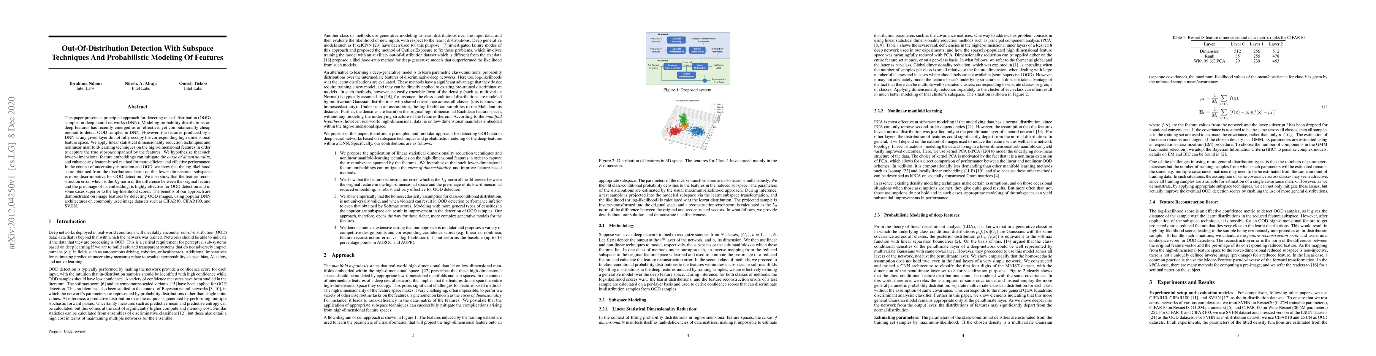 This paper proposes a method for detecting out-of-distribution samples in deep neural networks using subspace techniques and probabilistic modeling of features, showing that lower-dimensional embeddings enhance OOD detection performance compared to high-dimensional features. The approach combines dimensionality reduction and manifold learning to improve discriminative log-likelihood scores and feature reconstruction error for OOD detection.