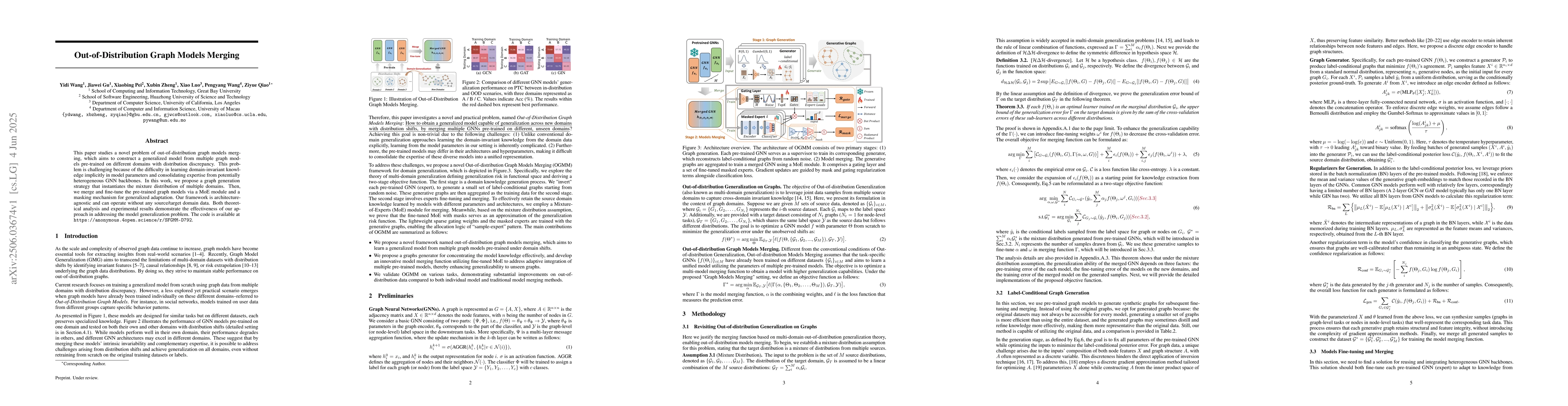 Researchers developed a method to merge multiple graph models trained on different domains with varying distribution discrepancies, enabling generalized model adaptation without source/target domain data. Their approach demonstrates effectiveness in addressing the model generalization problem through a novel graph generation strategy and MoE module.