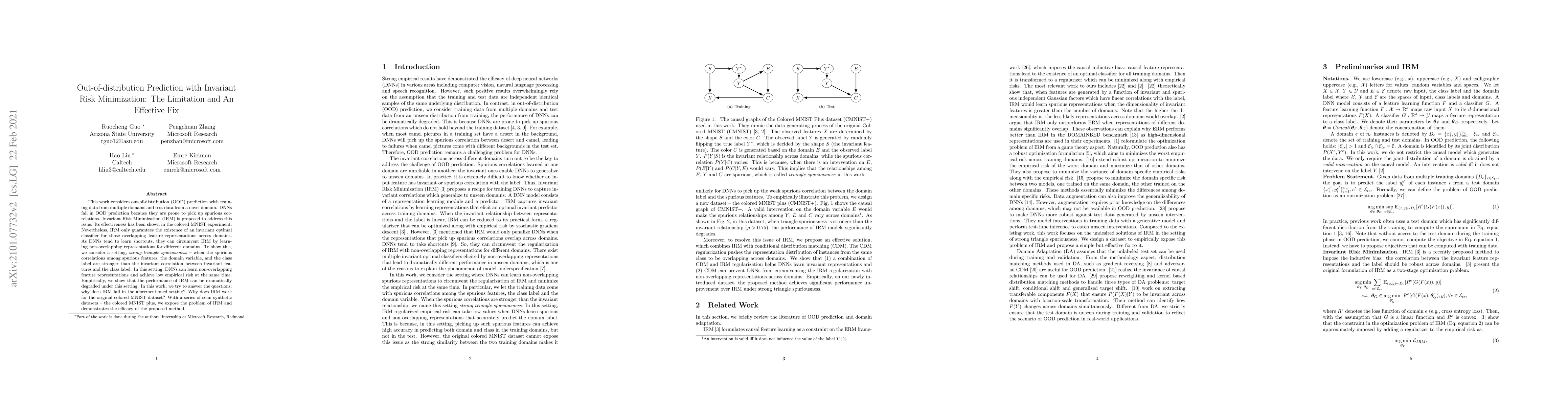 This work considers the out-of-distribution (OOD) prediction problem where (1)~the training data are from multiple domains and (2)~the test domain is unseen in the training. DNNs fail in OOD prediction because they are prone to pick up spurious correlations. Recently, Invariant Risk Minimization (IRM) is proposed to address this issue. Its effectiveness has been demonstrated in the colored MNIST experiment. Nevertheless, we find that the performance of IRM can be dramatically degraded under \emph{strong $\Lambda$ spuriousness} -- when the spurious correlation between the spurious features and the class label is strong due to the strong causal influence of their common cause, the domain label, on both of them (see Fig. 1). In this work, we try to answer the questions: why does IRM fail in the aforementioned setting? Why does IRM work for the original colored MNIST dataset? How can we fix this problem of IRM? Then, we propose a simple and effective approach to fix the problem of IRM. We combine IRM with conditional distribution matching to avoid a specific type of spurious correlation under strong $\Lambda$ spuriousness. Empirically, we design a series of semi synthetic datasets -- the colored MNIST plus, which exposes the problems of IRM and demonstrates the efficacy of the proposed method.