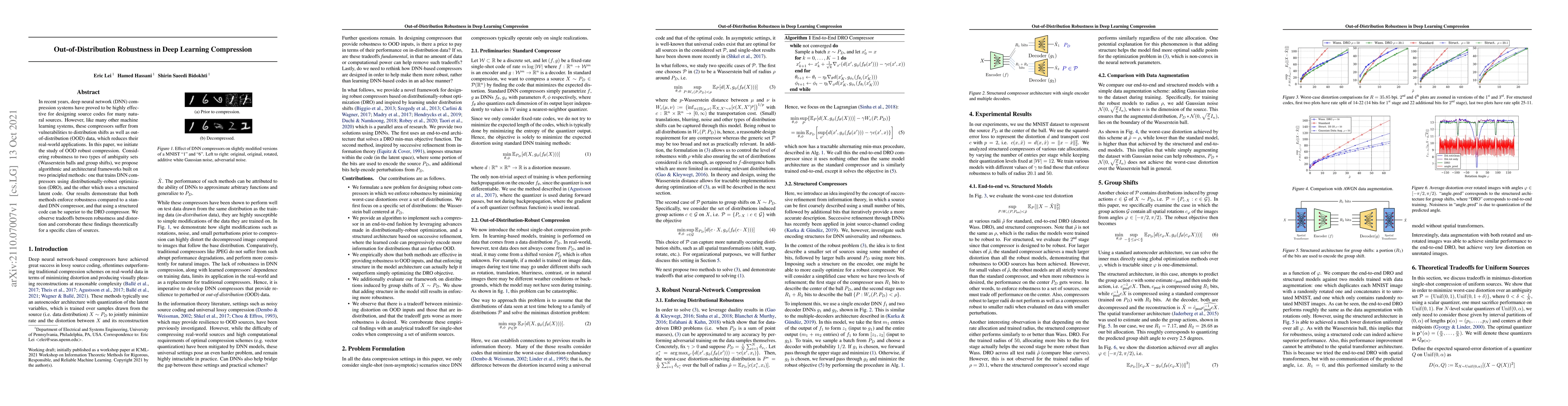 In recent years, deep neural network (DNN) compression systems have proved to be highly effective for designing source codes for many natural sources. However, like many other machine learning systems, these compressors suffer from vulnerabilities to distribution shifts as well as out-of-distribution (OOD) data, which reduces their real-world applications. In this paper, we initiate the study of OOD robust compression. Considering robustness to two types of ambiguity sets (Wasserstein balls and group shifts), we propose algorithmic and architectural frameworks built on two principled methods: one that trains DNN compressors using distributionally-robust optimization (DRO), and the other which uses a structured latent code. Our results demonstrate that both methods enforce robustness compared to a standard DNN compressor, and that using a structured code can be superior to the DRO compressor. We observe tradeoffs between robustness and distortion and corroborate these findings theoretically for a specific class of sources.