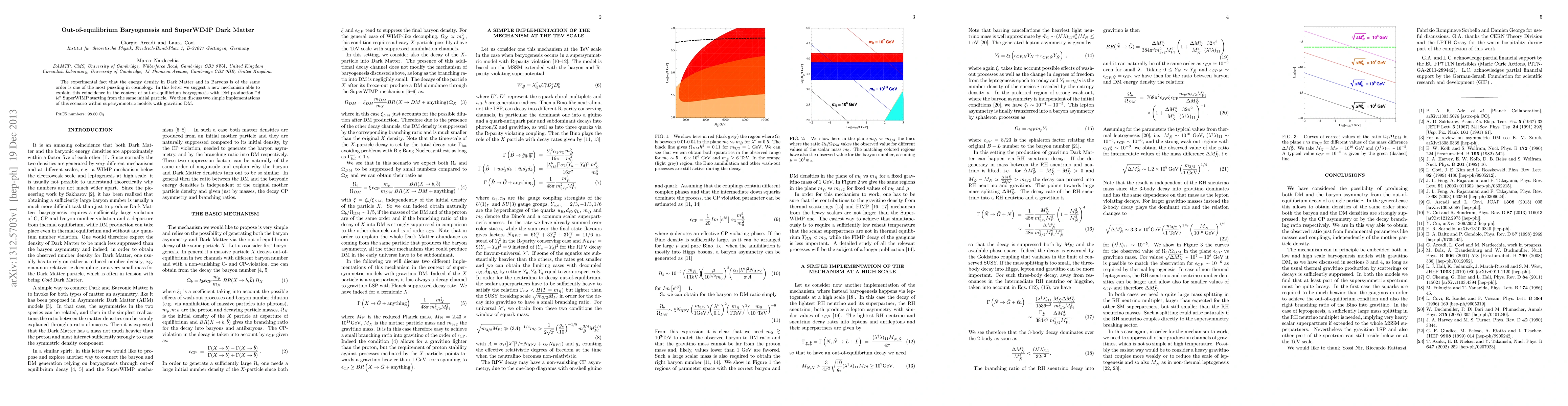 This paper proposes a novel mechanism for out-of-equilibrium baryogenesis that links the similar energy densities of Dark Matter and Baryons, suggesting both are produced from the same initial particle in the form of SuperWIMP. It explores two supersymmetric model implementations featuring gravitino Dark Matter.