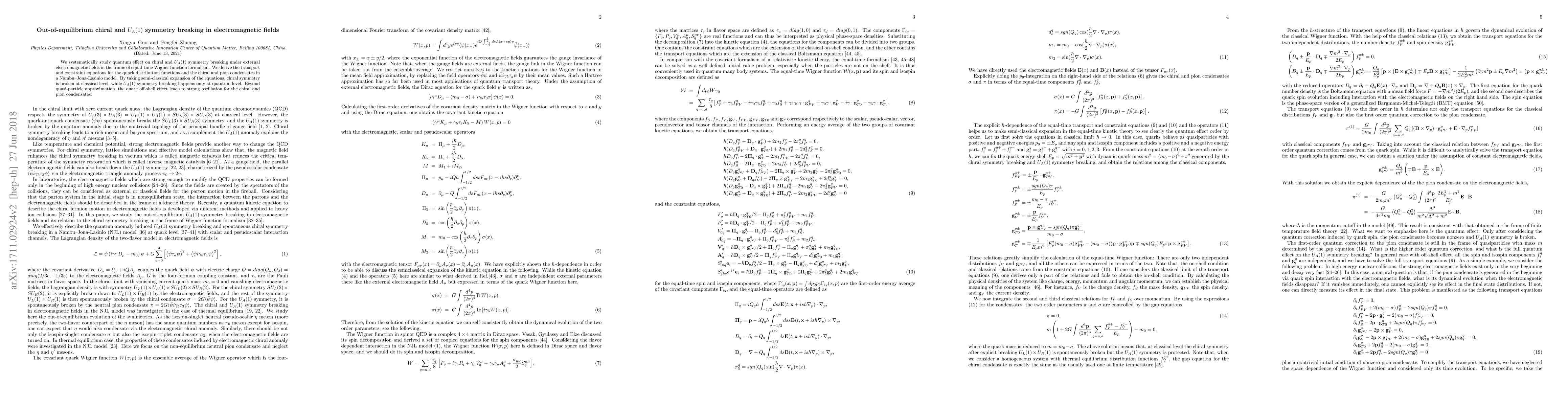 We systematically study quantum effect on chiral and $U_A(1)$ symmetry breaking under external electromagnetic fields in the frame of equal-time Wigner function formalism. We derive the transport and constraint equations for the quark distribution functions and the chiral and pion condensates in a Nambu--Jona-Lasinio model. By taking semi-classical expansion of the equations, chiral symmetry is broken at classical level, while $U_A(1)$ symmetry breaking happens only at quantum level. Beyond quasi-particle approximation, the quark off-shell effect leads to strong oscillation for the chiral and pion condensates.
