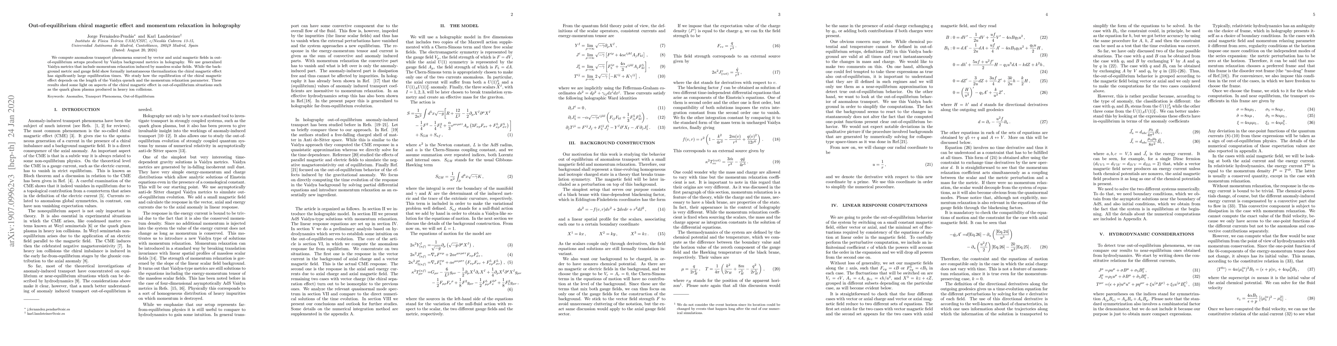 This research investigates anomalous transport phenomena in out-of-equilibrium holographic models using Vaidya metrics, revealing significant equilibration times for the chiral magnetic effect despite instantaneous thermalization. The study examines the impact of Vaidya quench length and momentum relaxation on the equilibration process, providing insights into chiral magnetic effects in systems like quark gluon plasmas.