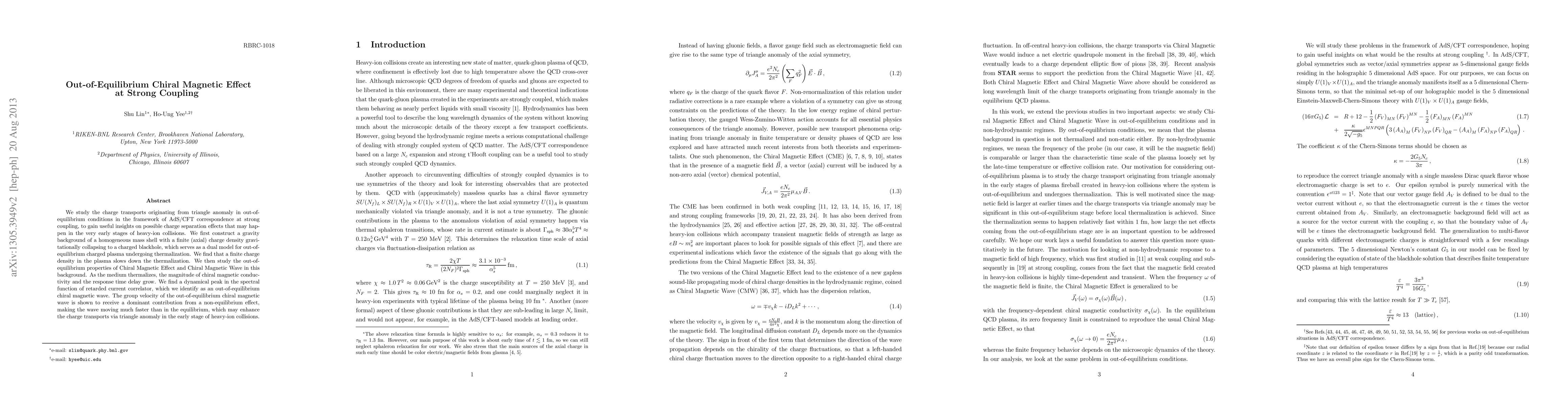 We study the charge transports originating from triangle anomaly in out-of-equilibrium conditions in the framework of AdS/CFT correspondence at strong coupling, to gain useful insights on possible charge separation effects that may happen in the very early stages of heavy-ion collisions. We first construct a gravity background of a homogeneous mass shell with a finite (axial) charge density gravitationally collapsing to a charged blackhole, which serves as a dual model for out-of-equilibrium charged plasma undergoing thermalization. We find that a finite charge density in the plasma slows down the thermalization. We then study the out-of-equilibrium properties of Chiral Magnetic Effect and Chiral Magnetic Wave in this background. As the medium thermalizes, the magnitude of chiral magnetic conductivity and the response time delay grow. We find a dynamical peak in the spectral function of retarded current correlator, which we identify as an out-of-equilibrium chiral magnetic wave. The group velocity of the out-of-equilibrium chiral magnetic wave is shown to receive a dominant contribution from a non-equilibrium effect, making the wave moving much faster than in the equilibrium, which may enhance the charge transports via triangle anomaly in the early stage of heavy-ion collisions.