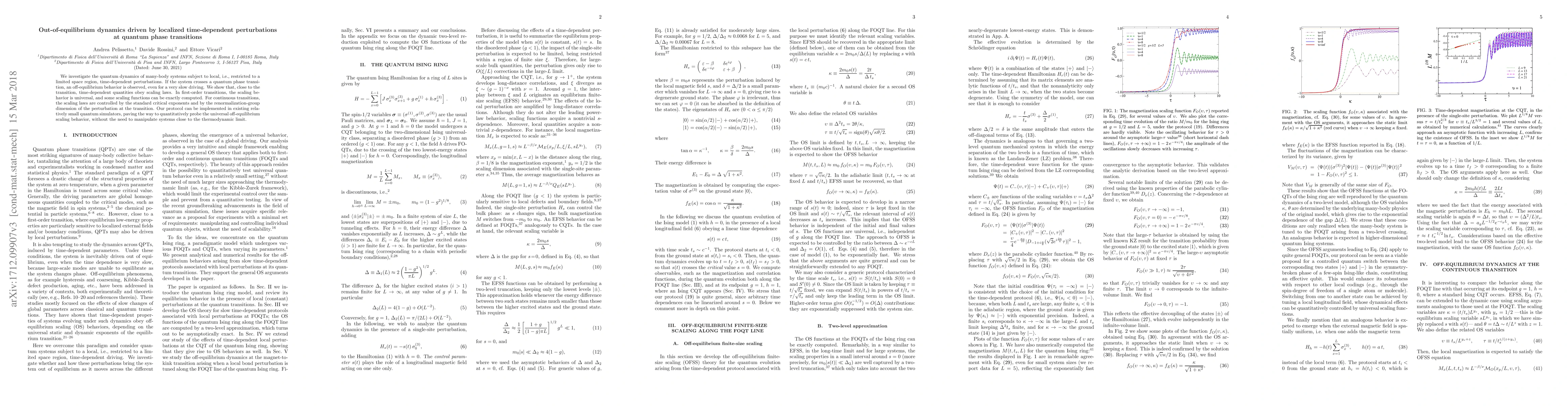 We investigate the quantum dynamics of many-body systems subject to local, i.e. restricted to a limited space region, time-dependent perturbations. If the perturbation drives the system across a quantum transition, an off-equilibrium behavior is observed, even when the perturbation is very slow. We show that, close to the transition, time-dependent quantities obey scaling laws. In first-order quantum transitions, the scaling behavior is universal, and some scaling functions can be exactly computed. For continuous quantum transitions, the scaling laws are controlled by the standard critical exponents and by the renormalization-group dimension of the perturbation at the transition. Our scaling approach is applied to the quantum Ising ring which presents both first-order and continuous quantum transitions.