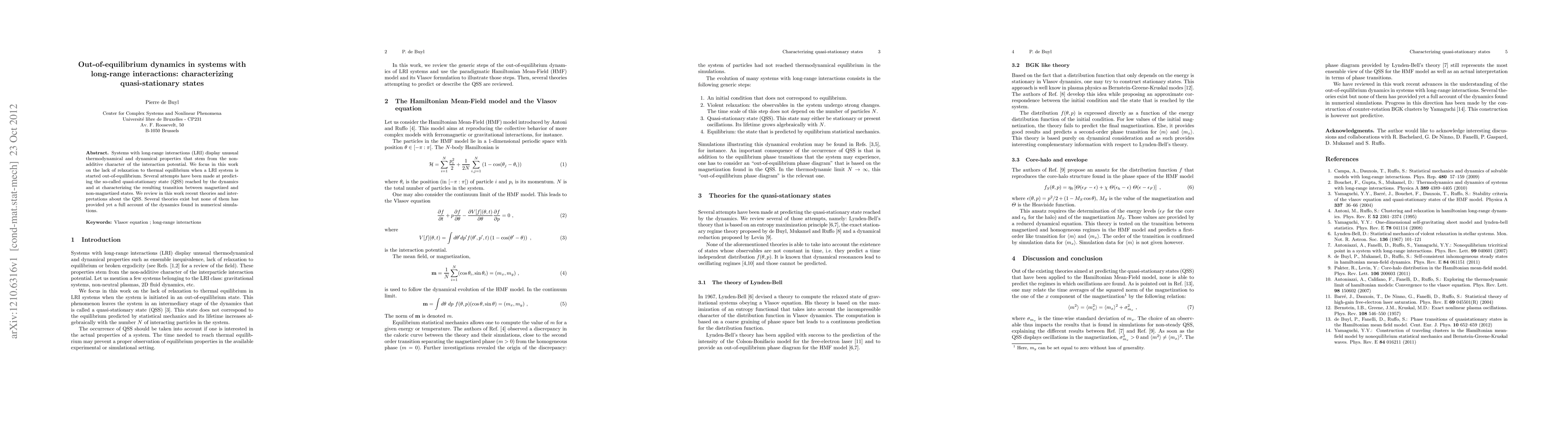 Systems with long-range interactions (LRI) display unusual thermodynamical and dynamical properties that stem from the non-additive character of the interaction potential. We focus in this work on the lack of relaxation to thermal equilibrium when a LRI system is started out-of-equilibrium. Several attempts have been made at predicting the so-called quasi-stationary state (QSS) reached by the dynamics and at characterizing the resulting transition between magnetized and non-magnetized states. We review in this work recent theories and interpretations about the QSS. Several theories exist but none of them has provided yet a full account of the dynamics found in numerical simulations.