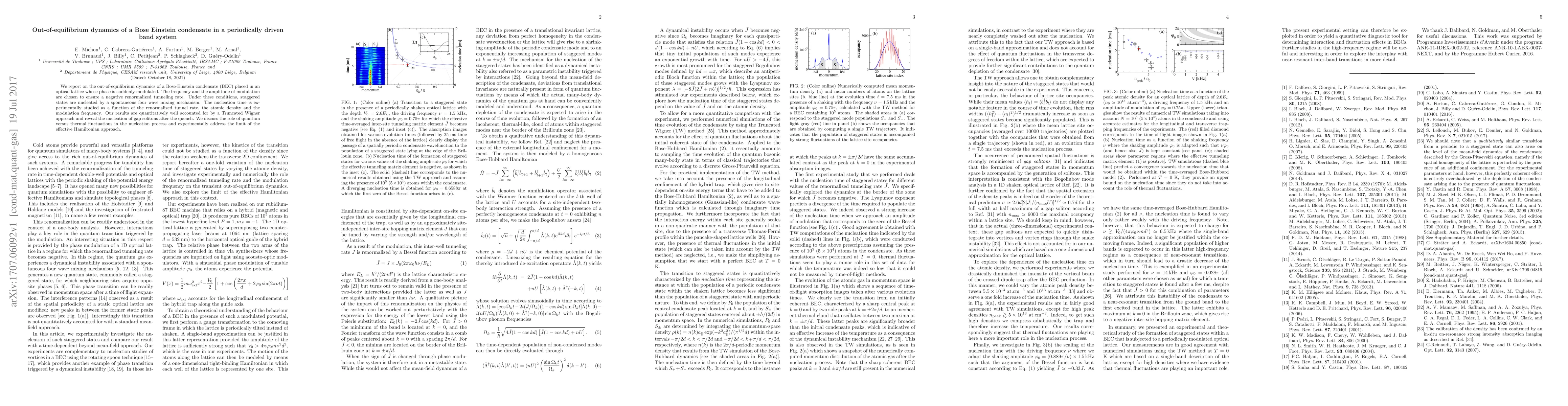 We report on the out-of-equilibrium dynamics of a Bose-Einstein condensate (BEC) placed in an optical lattice whose phase is suddenly modulated. The frequency and the amplitude of modulation are chosen to ensure a negative renormalized tunneling rate. Under these conditions, staggered states are nucleated by a spontaneous four wave mixing mechanism. The nucleation time is experimentally studied as a function of the renormalized tunnel rate, the atomic density and the modulation frequency. Our results are quantitatively well accounted for by a Truncated Wigner approach and reveal the nucleation of gap solitons after the quench. We discuss the role of quantum versus thermal fluctuations in the nucleation process and experimentally address the limit of the effective Hamiltonian approach.