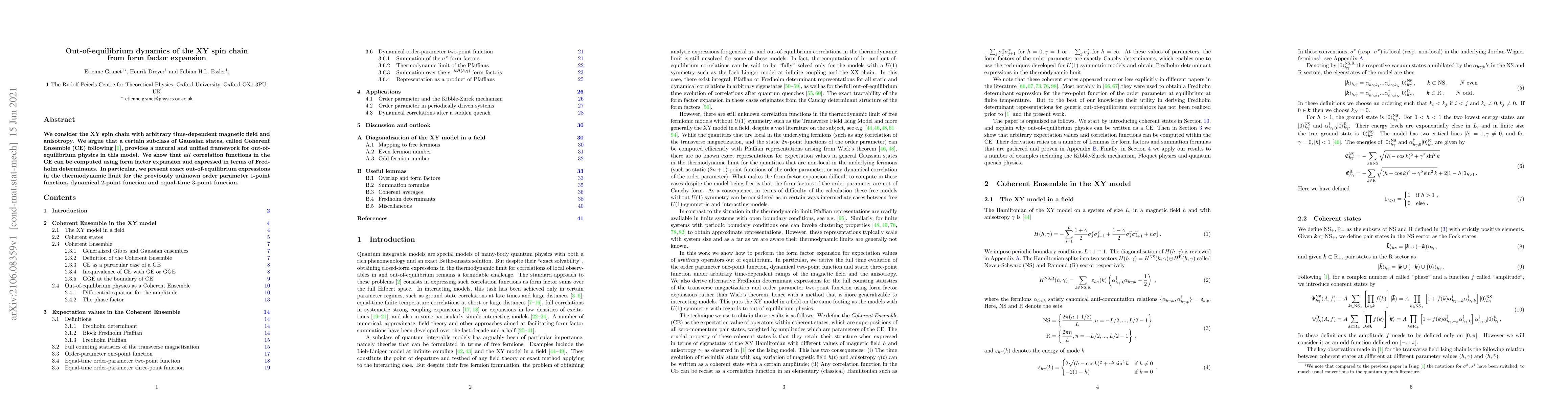 We consider the XY spin chain with arbitrary time-dependent magnetic field and anisotropy. We argue that a certain subclass of Gaussian states, called Coherent Ensemble (CE) following [1], provides a natural and unified framework for out-of-equilibrium physics in this model. We show that $all$ correlation functions in the CE can be computed using form factor expansion and expressed in terms of Fredholm determinants. In particular, we present exact out-of-equilibrium expressions in the thermodynamic limit for the previously unknown order parameter one-point function, dynamical two-point function and equal-time three-point function.